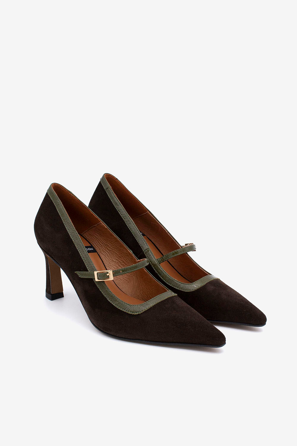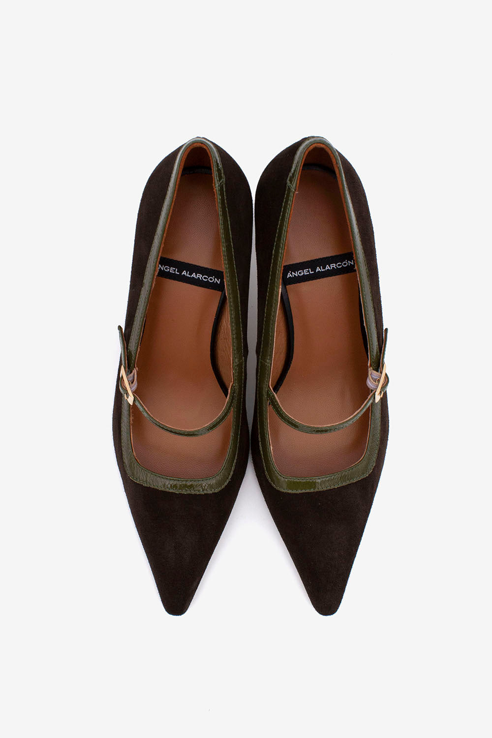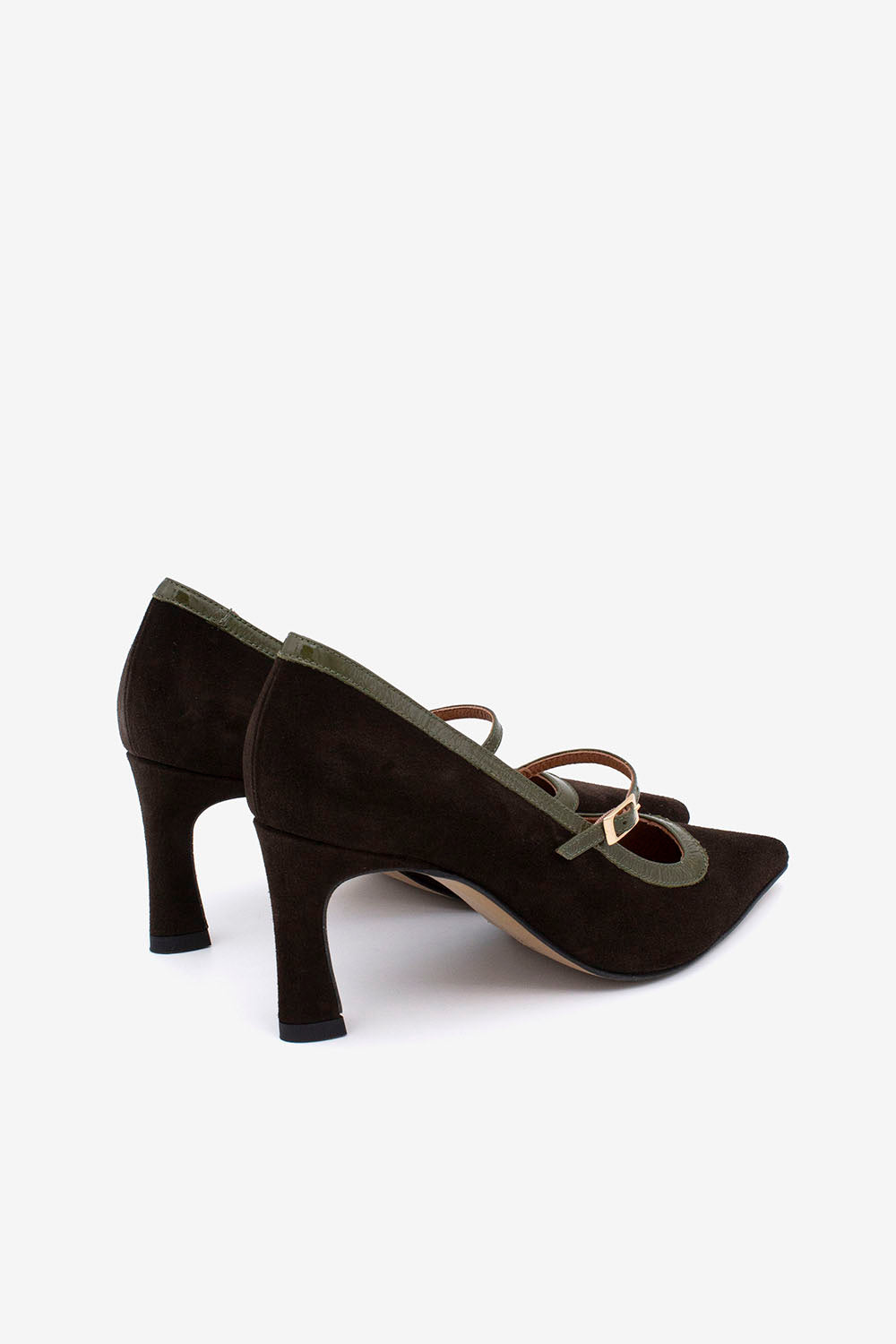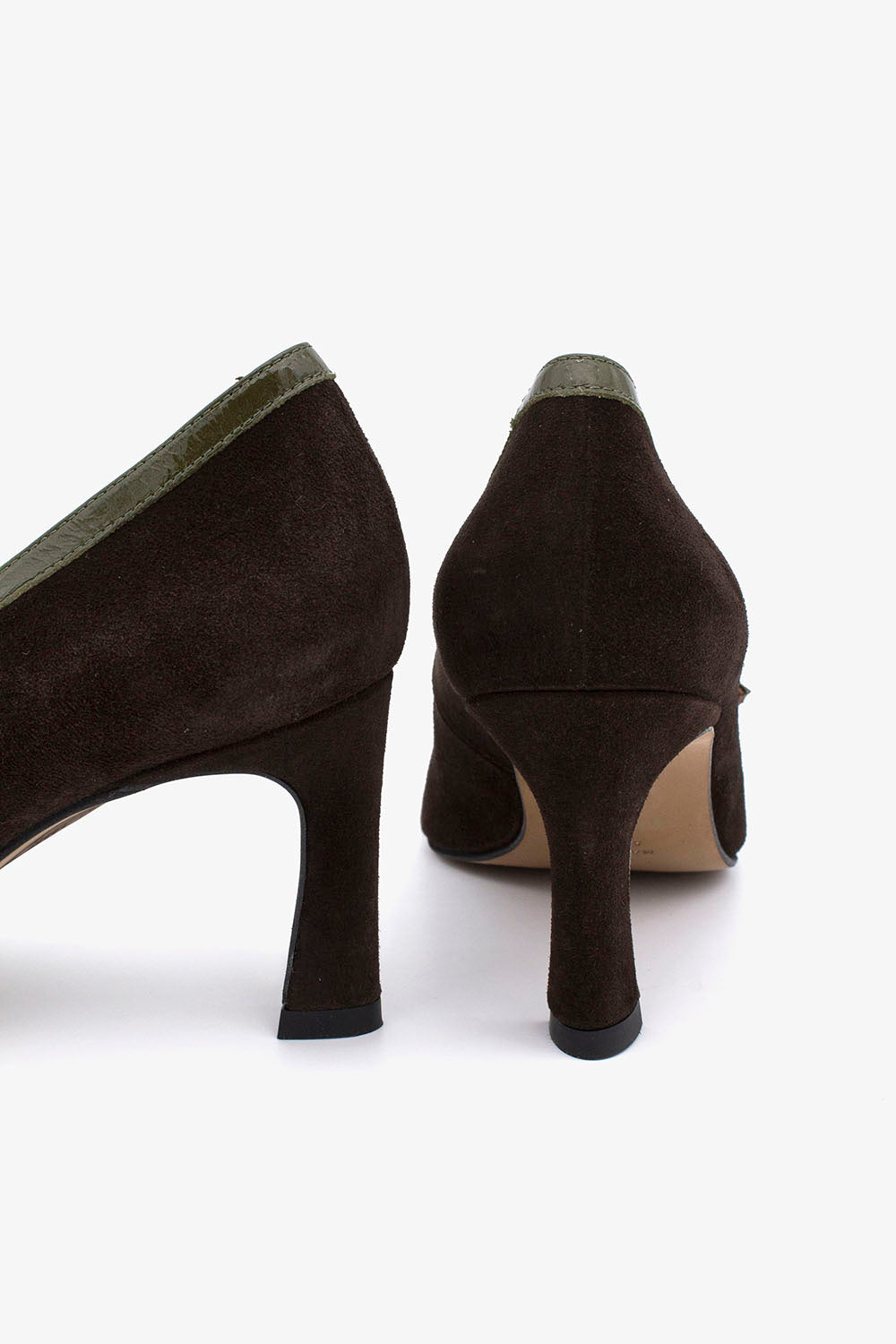Décolleté in pelle liscia e pelle scamosciata, nei toni del verde a contrasto.
