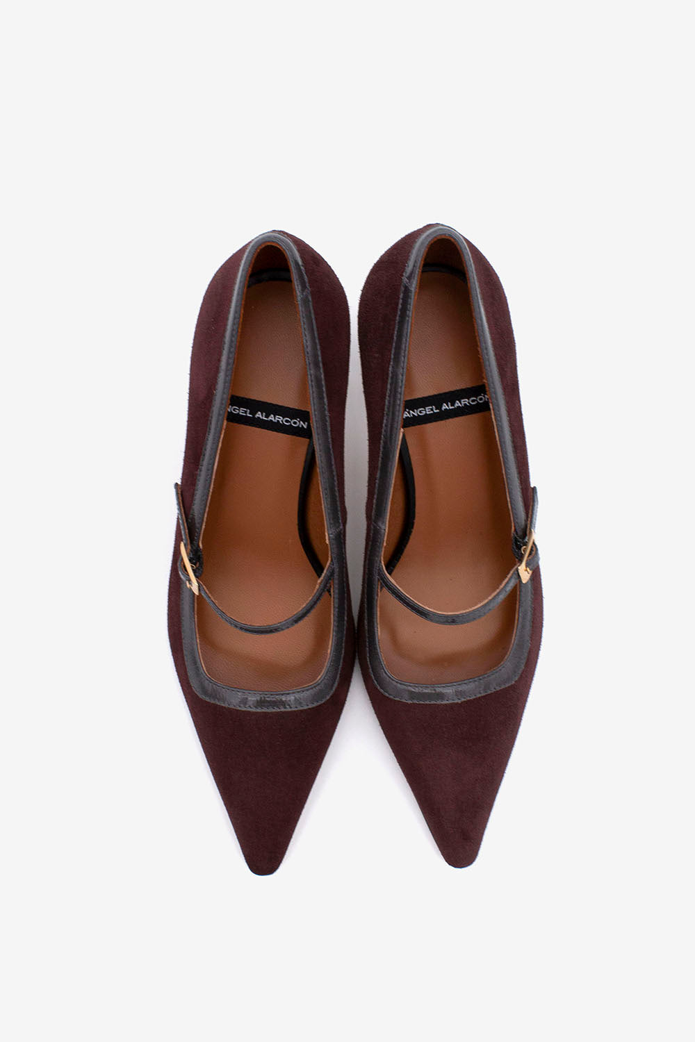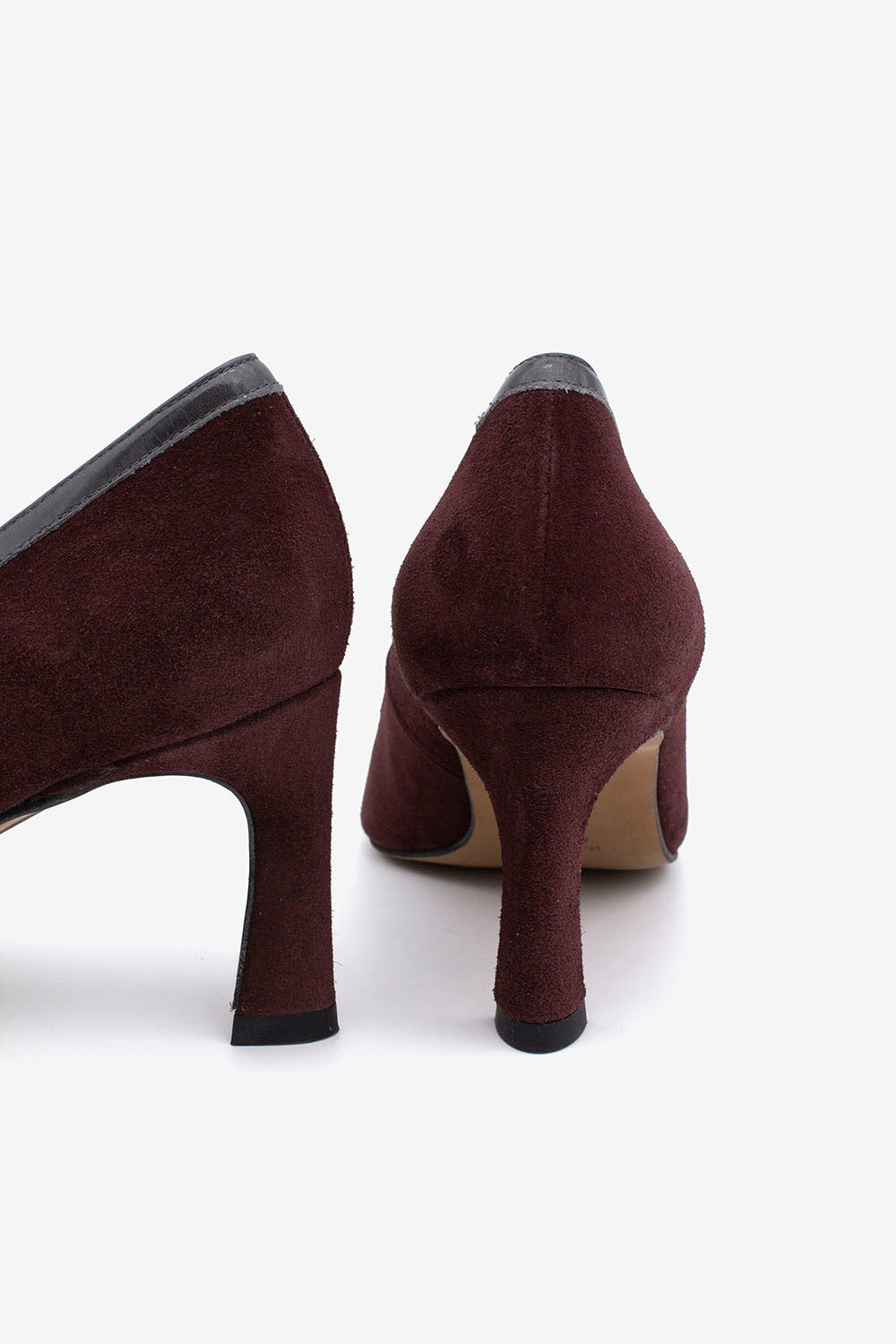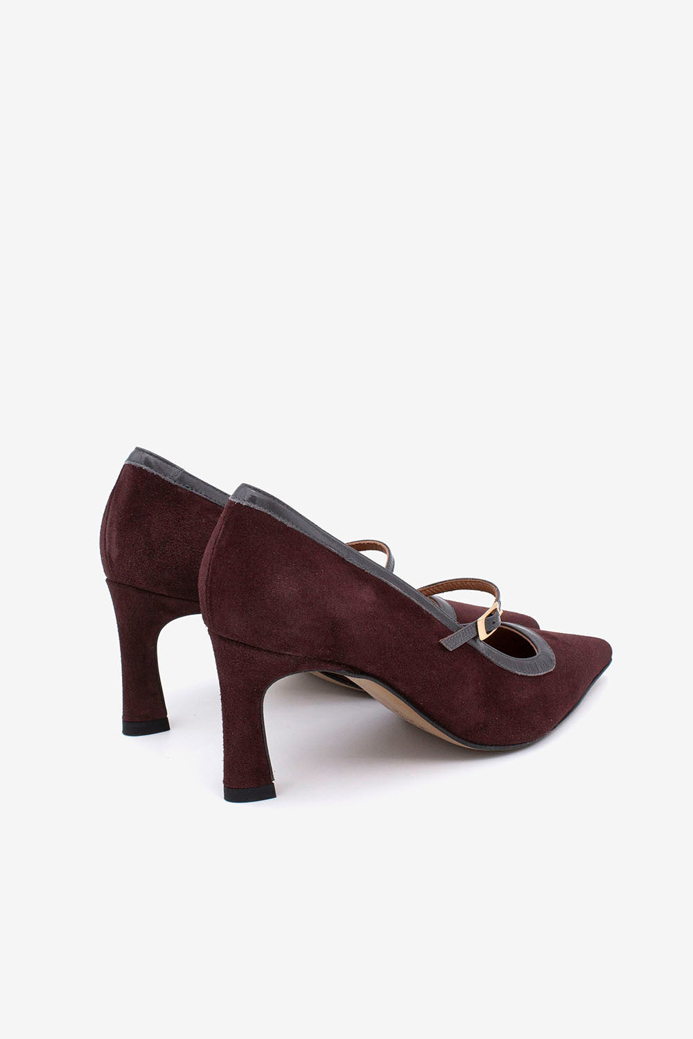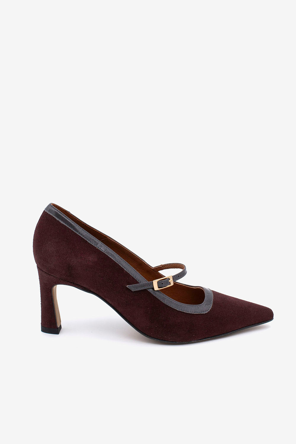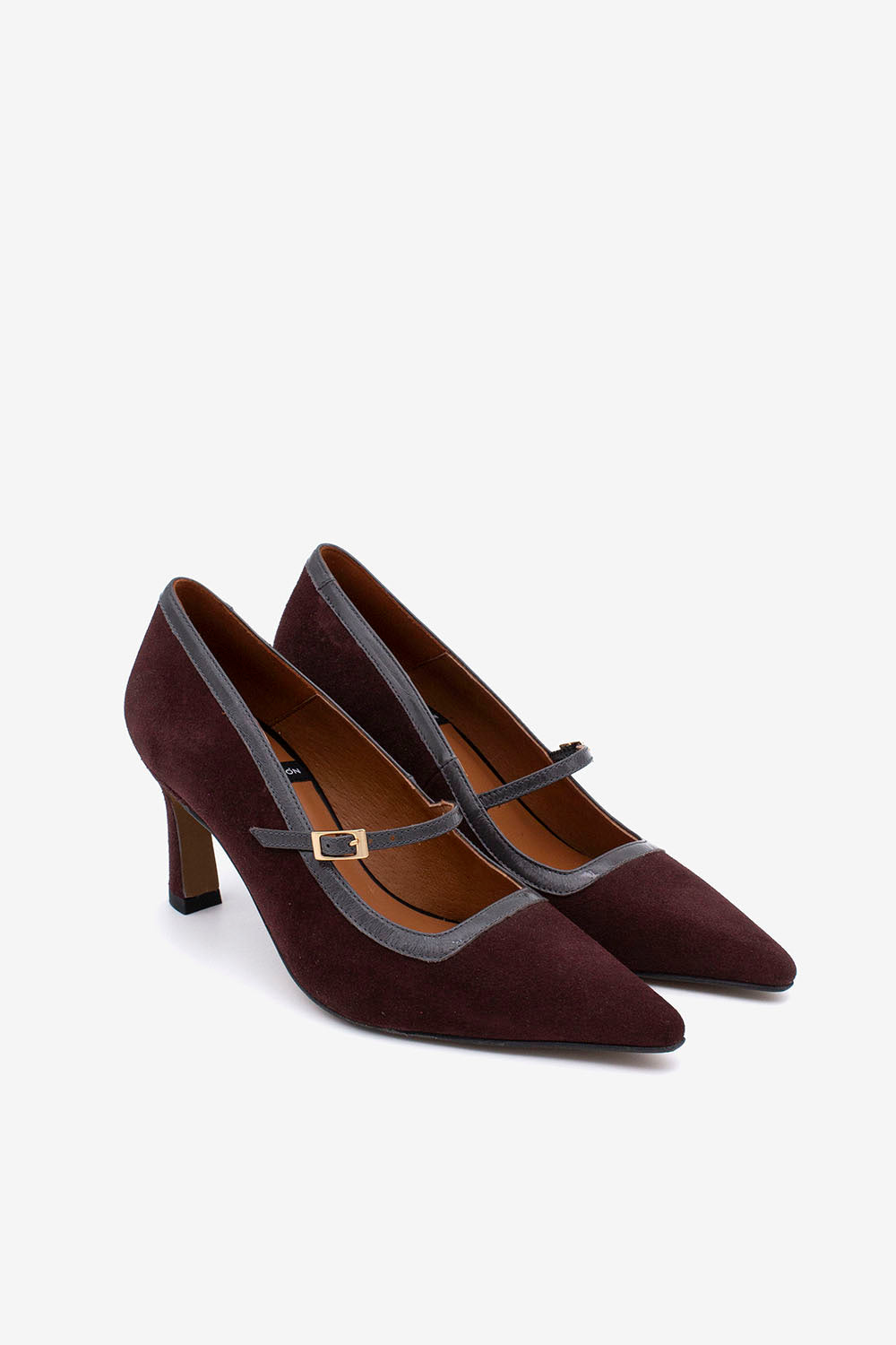 Décolleté in pelle liscia e pelle scamosciata, nei toni del viola e grigio a contrasto.