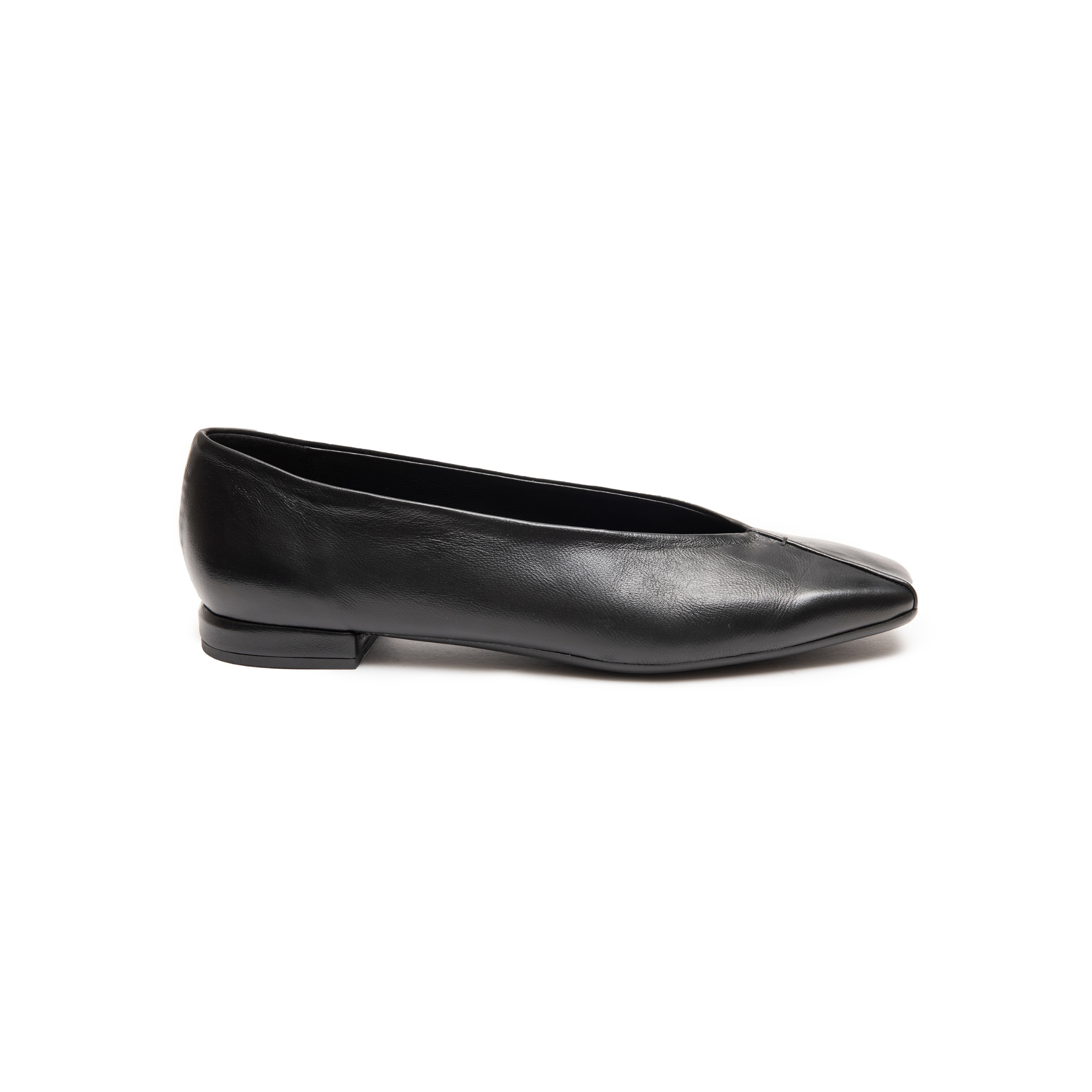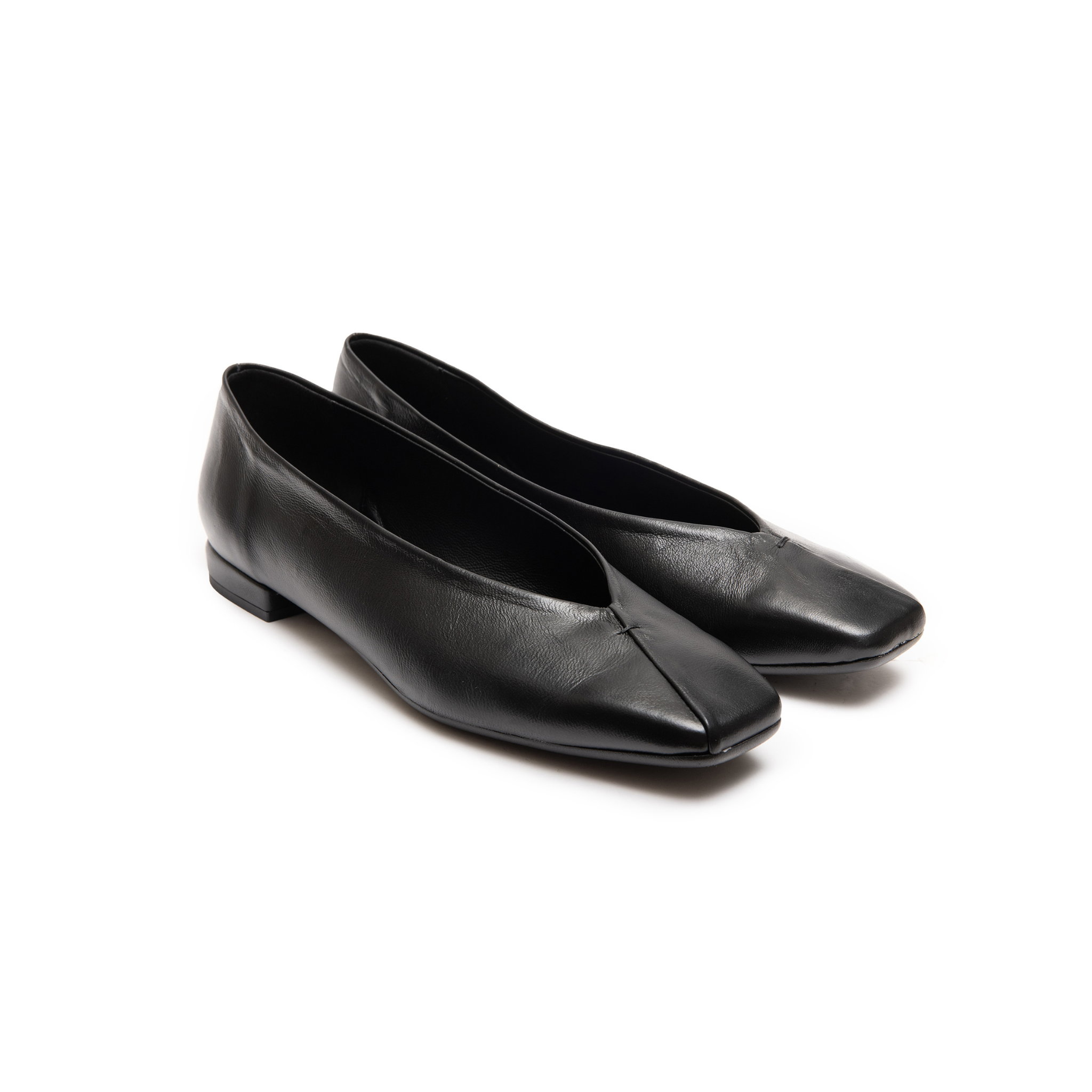 Ballerina in nappa nera dalla punta squadrata con una leggera cucitura centrale che ne accentua la linea.