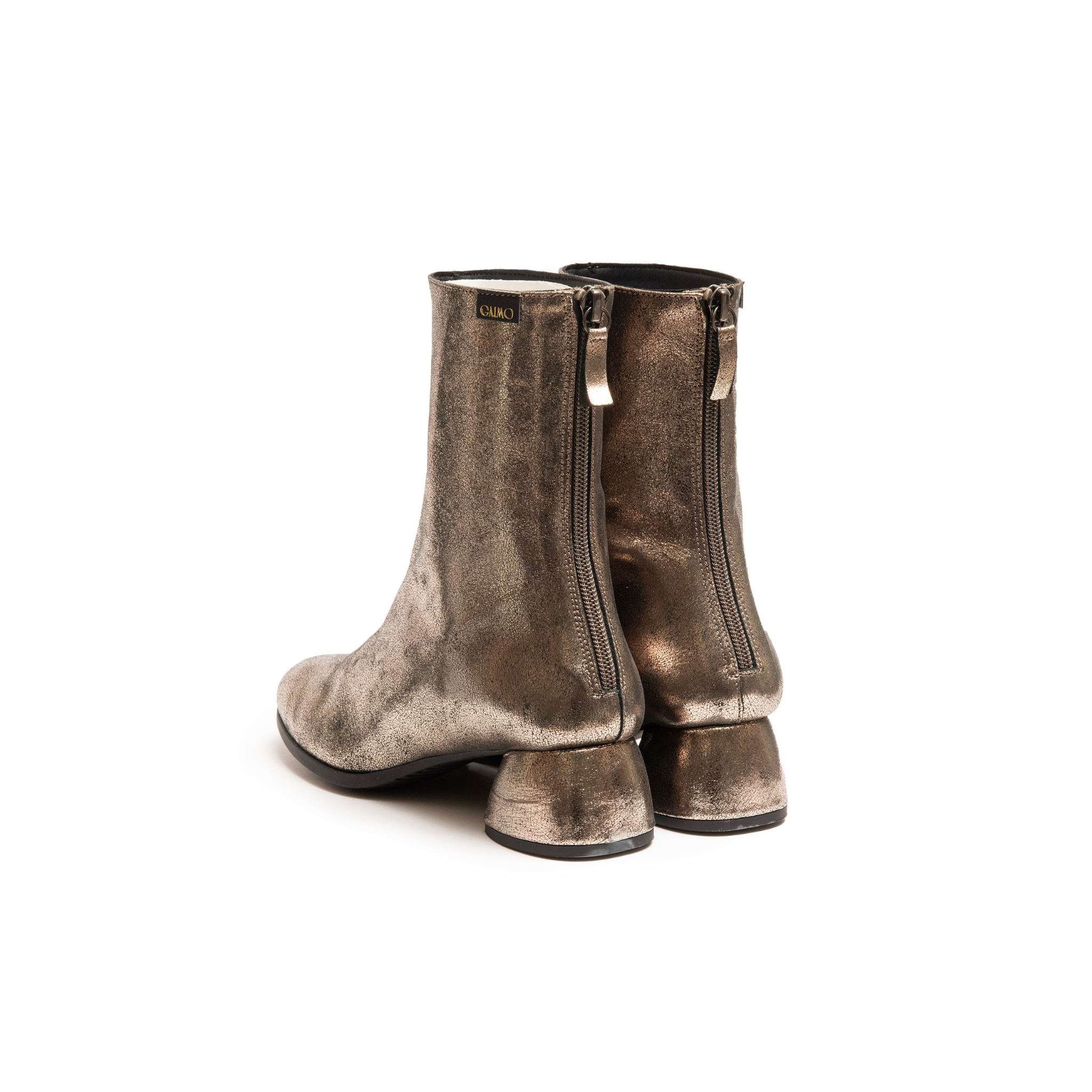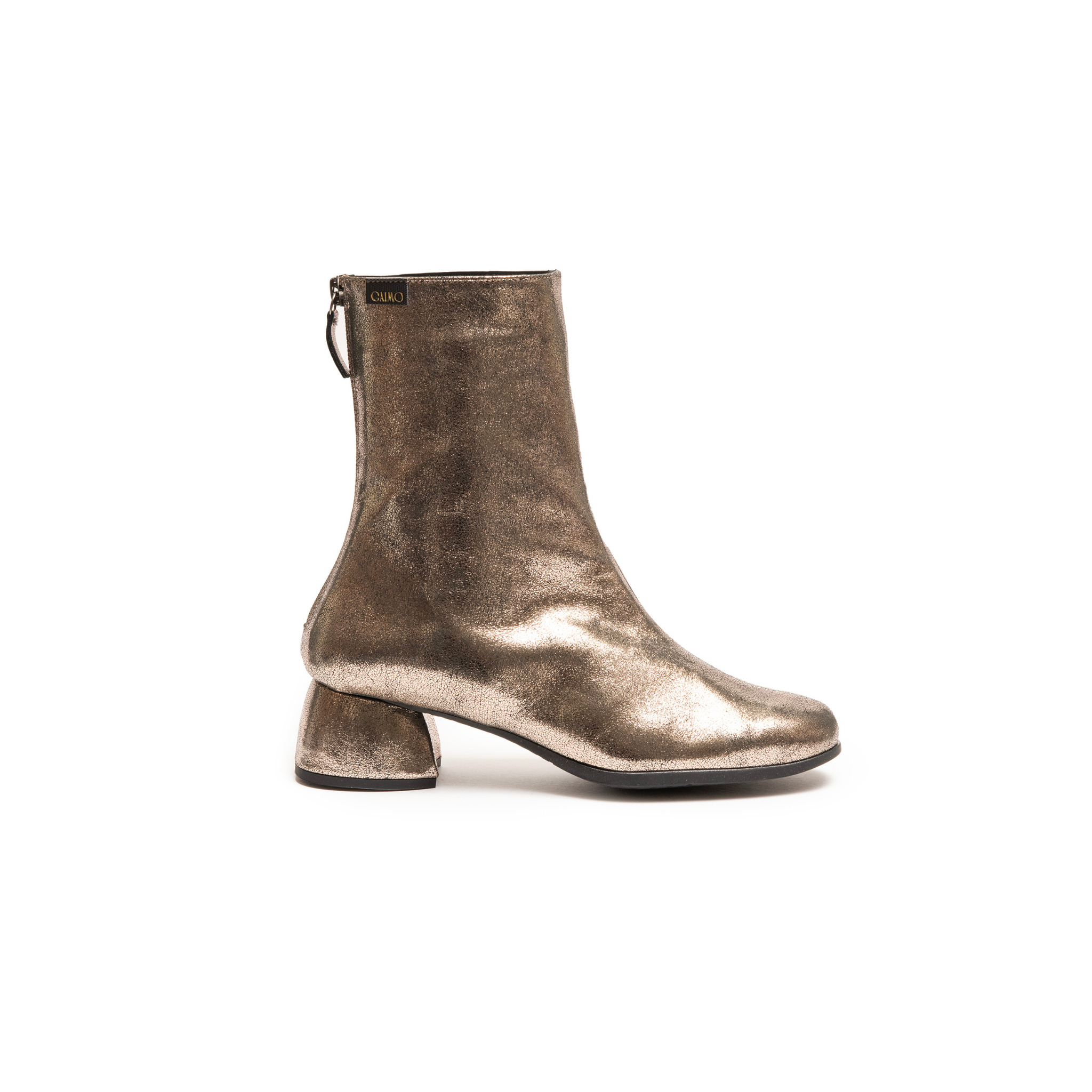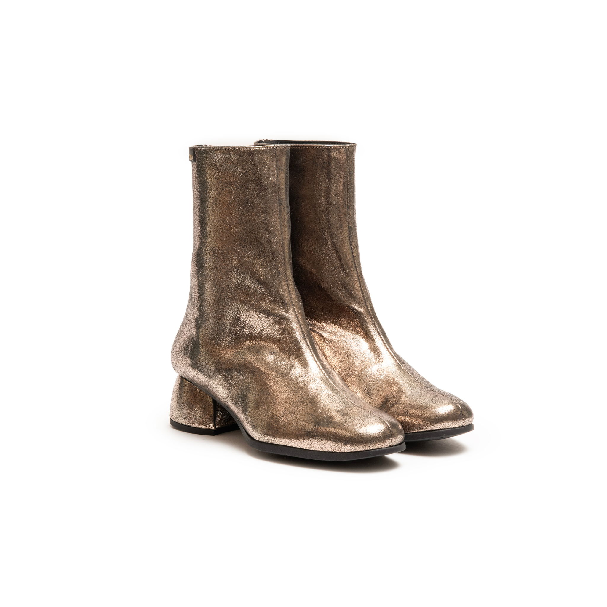 Un tronchetto che unisce eleganza e comfort, realizzato a mano in morbida nappa disponibile in tre colorazioni: blu, crema e laminato. Chiusura zip posteriore e soletta interna imbottita. Suola antiscivolo.