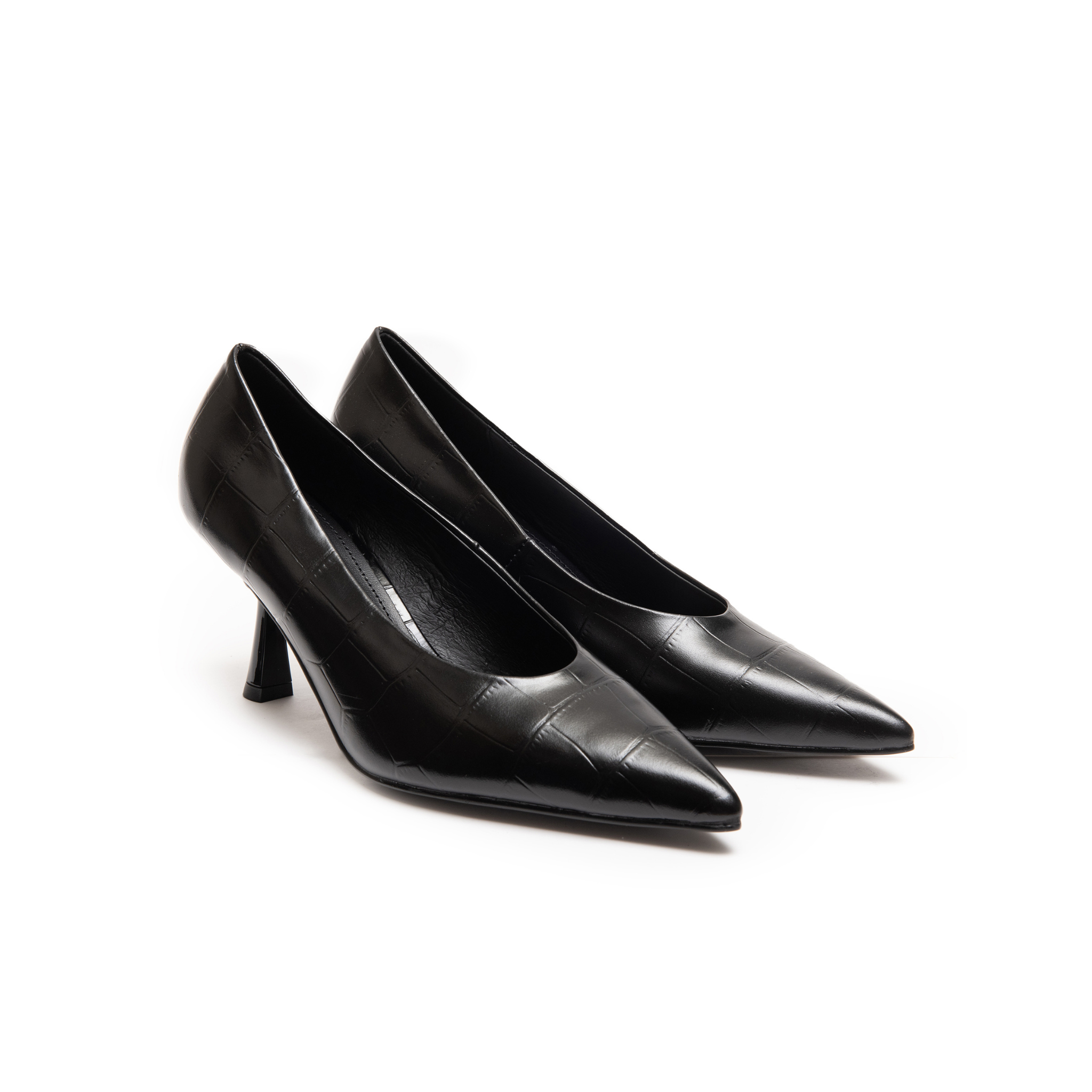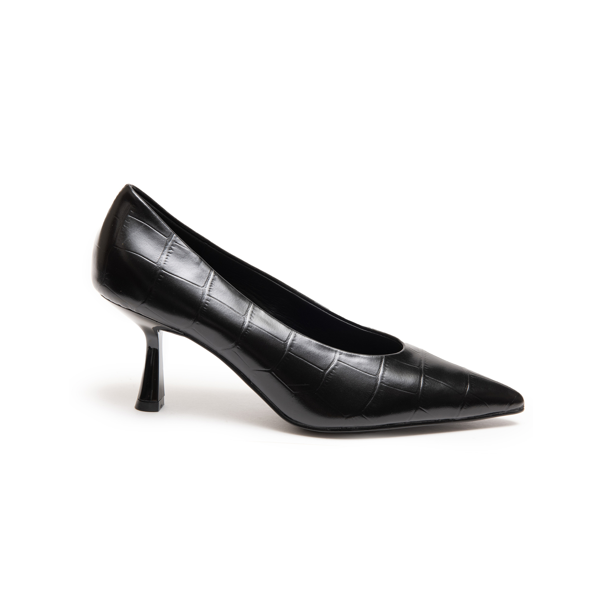 Caratterizzato da una silhouette affusolata con punta pronunciata e scollatura a V che slancia la figura. Il tacco sottile svasato aggiunge femminilità e modernità, rendendola perfetta sotto ogni look.