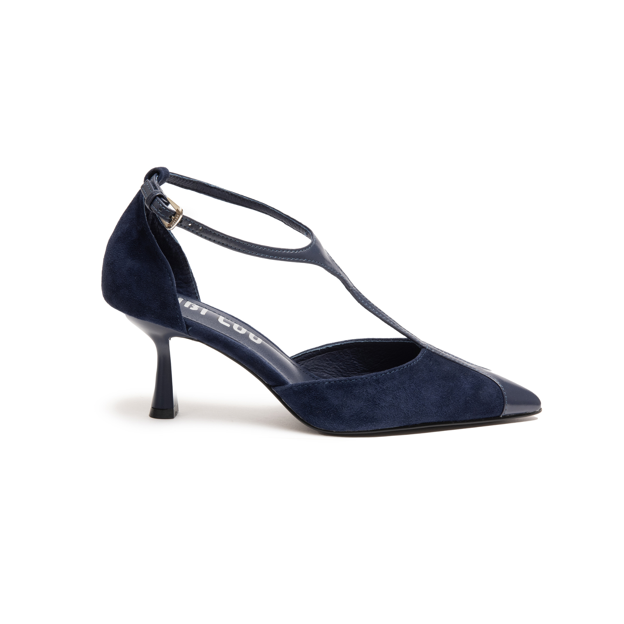 Design elegante con punta affusolata e cinturino a T che slancia la silhouette.