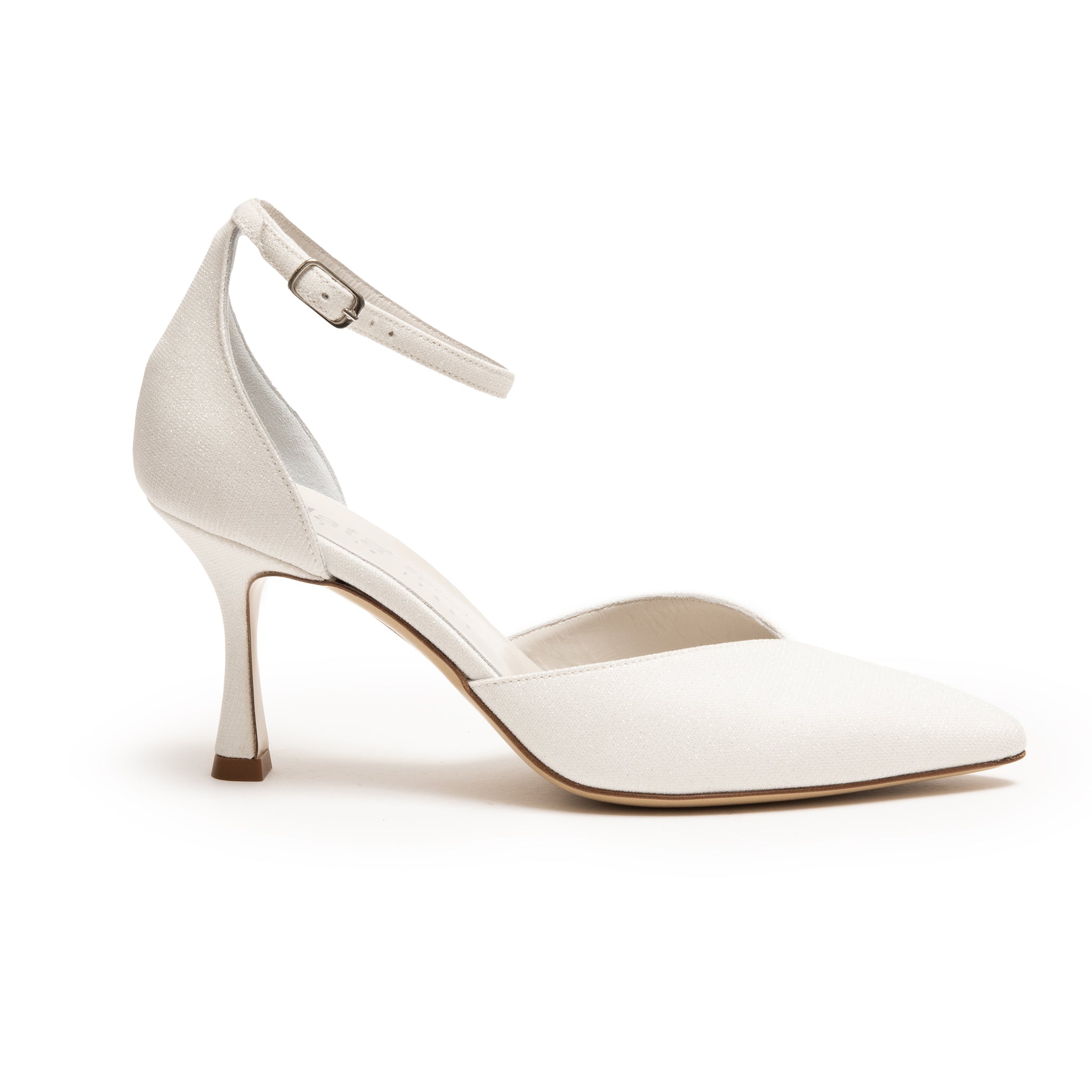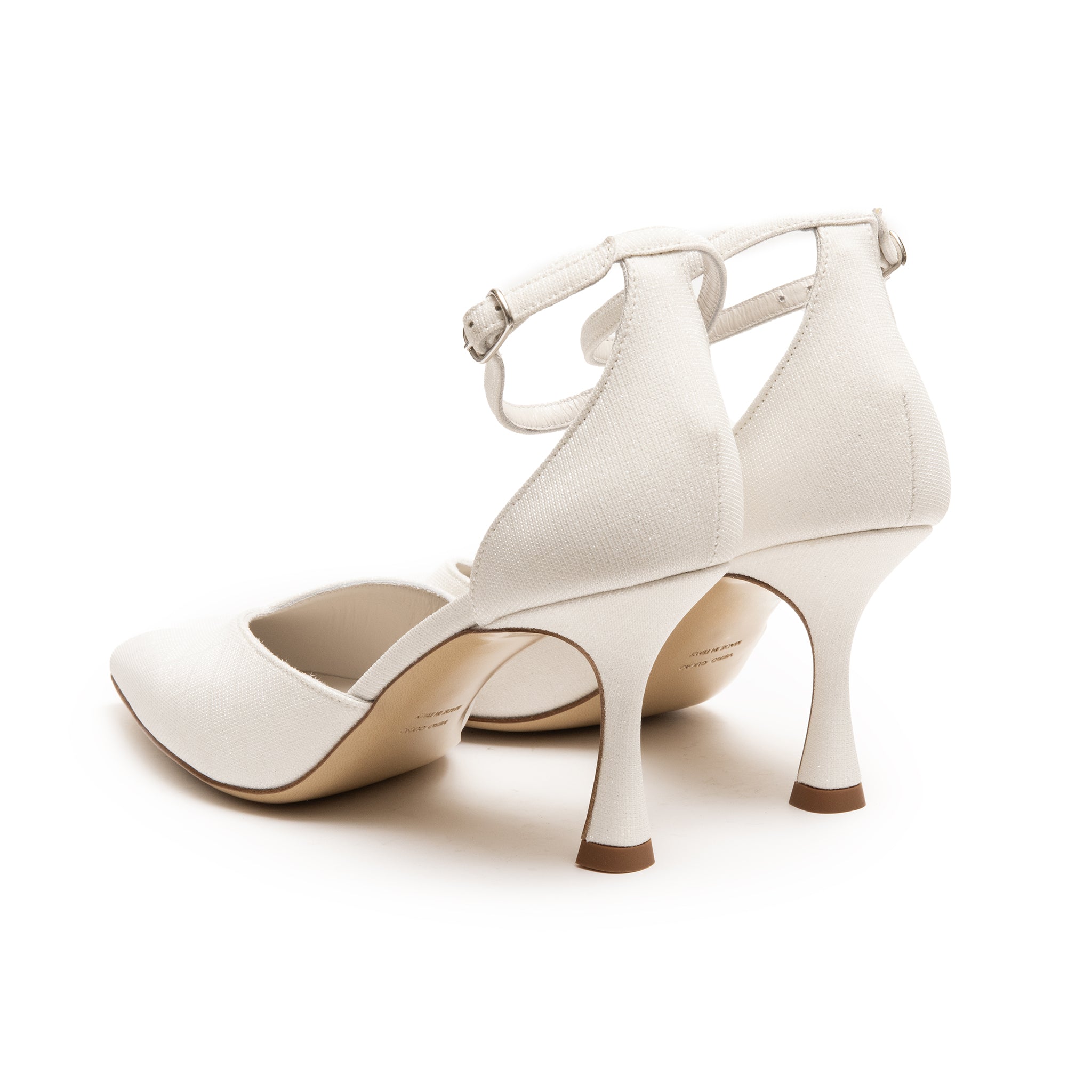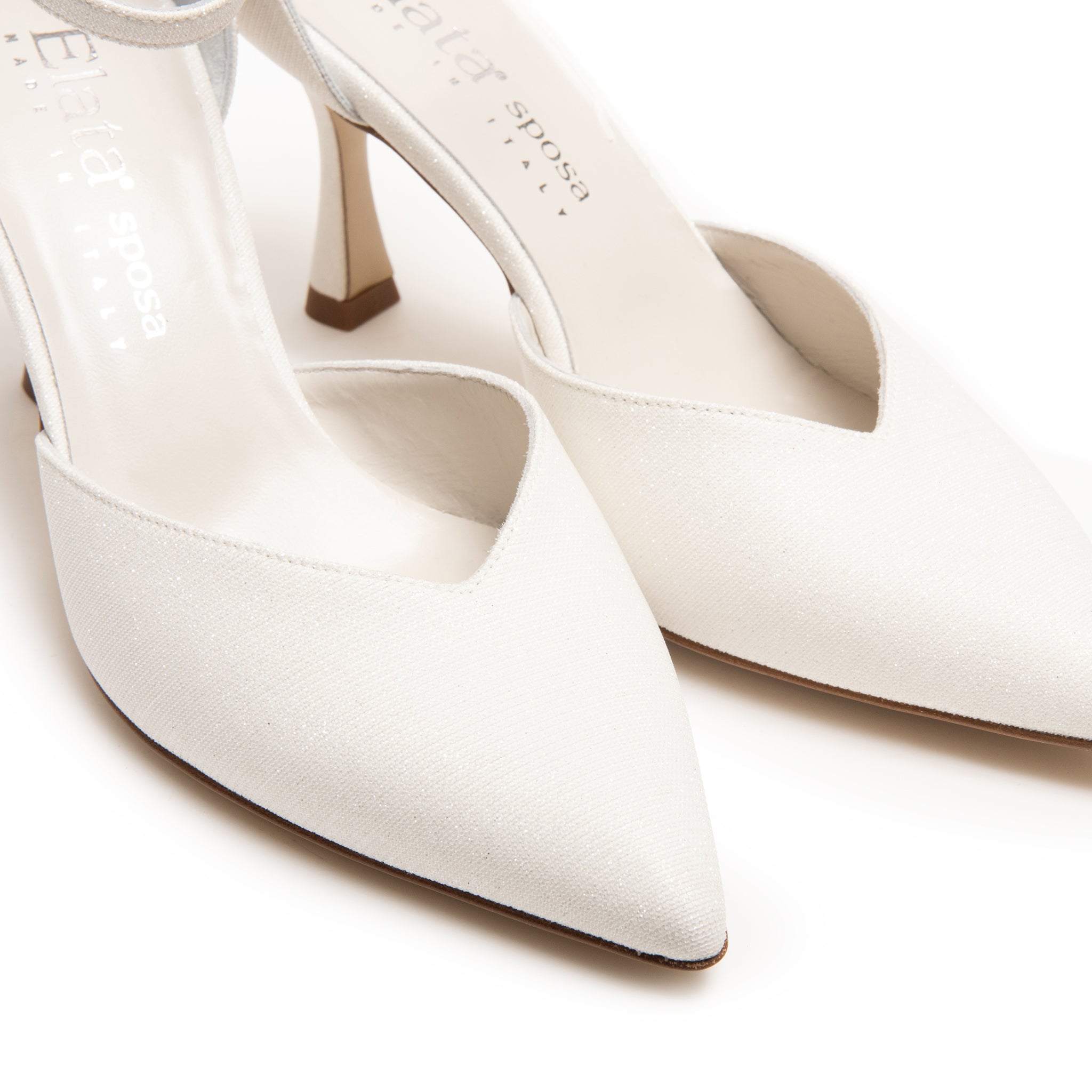 Decolleté in tessuto laminato bianco con un delicato effetto "brillantini", che dona alla scarpa un tocco di eleganza e luminosità.