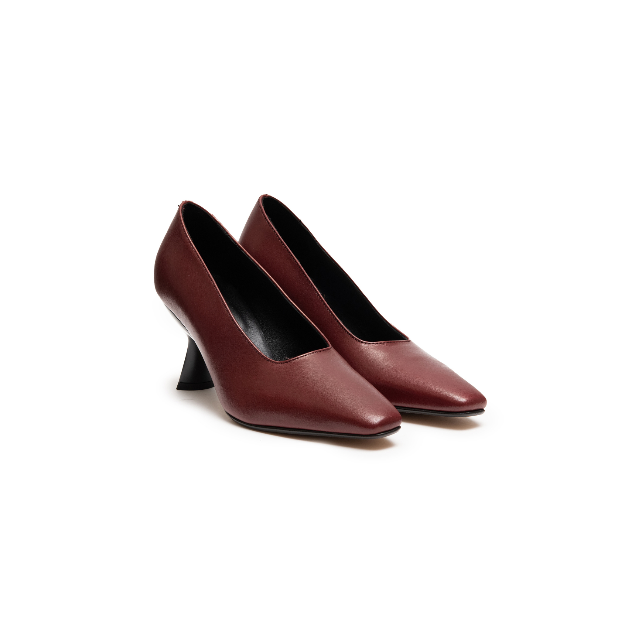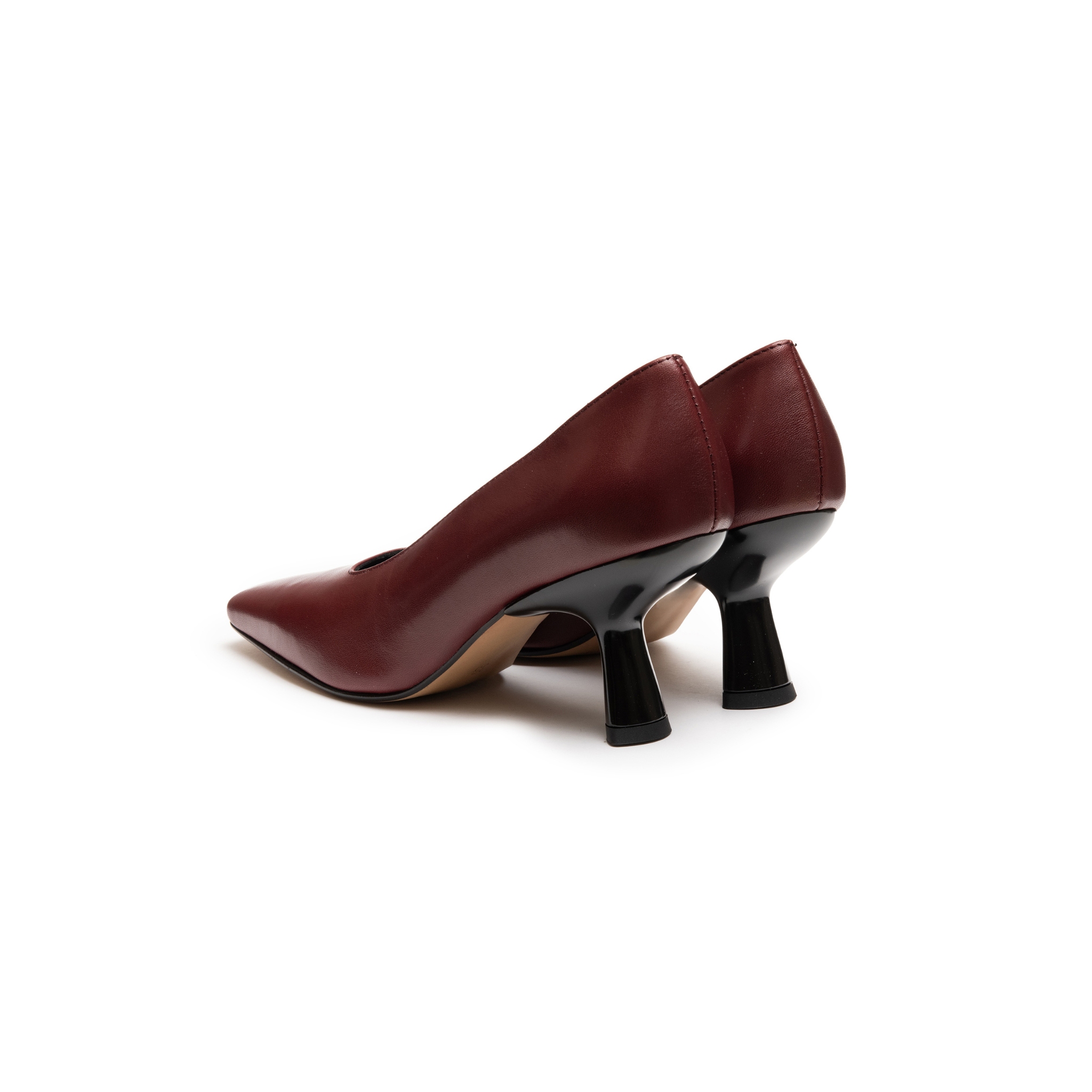 Décolleté in pelle bordeaux con tacco a rocchetto nero lucido.