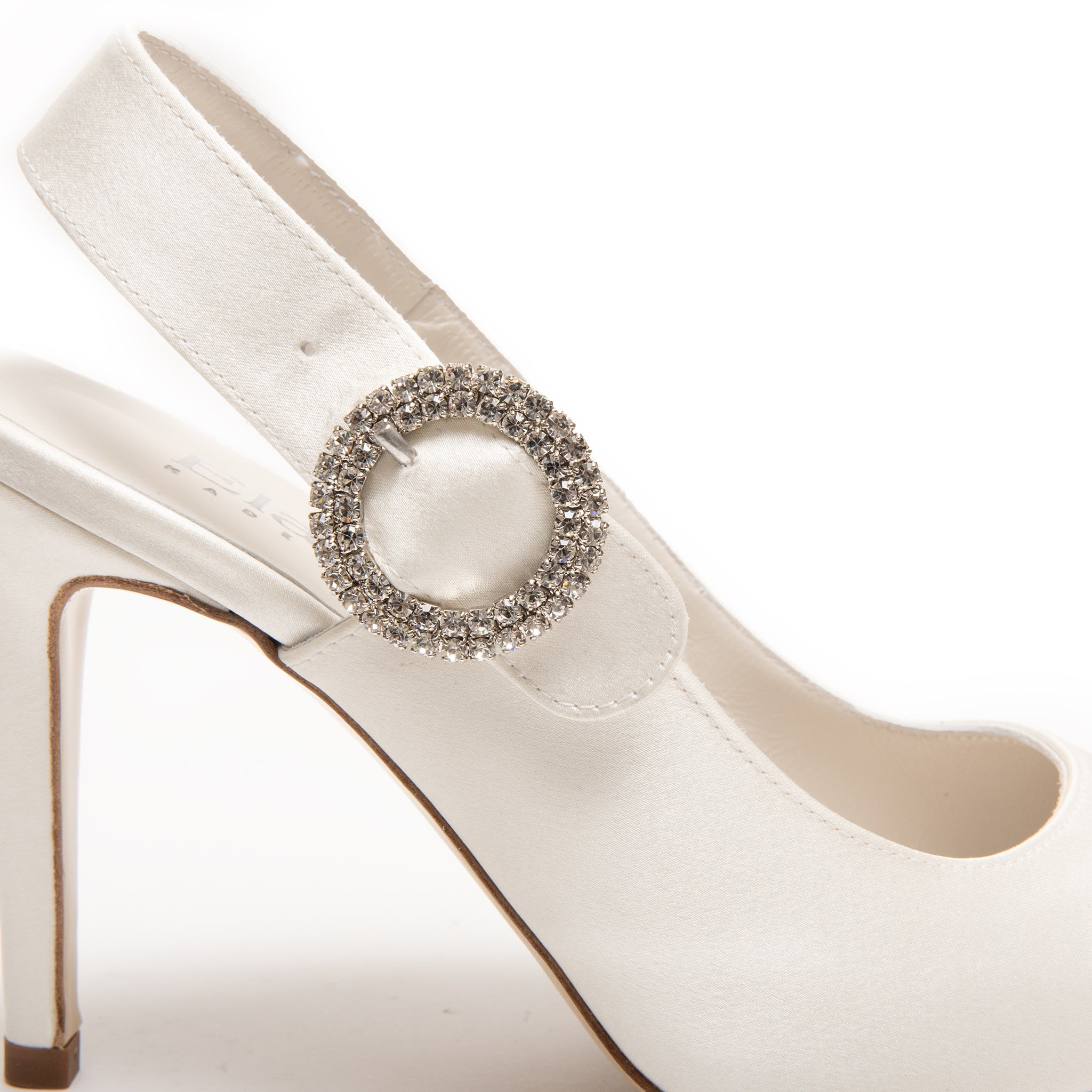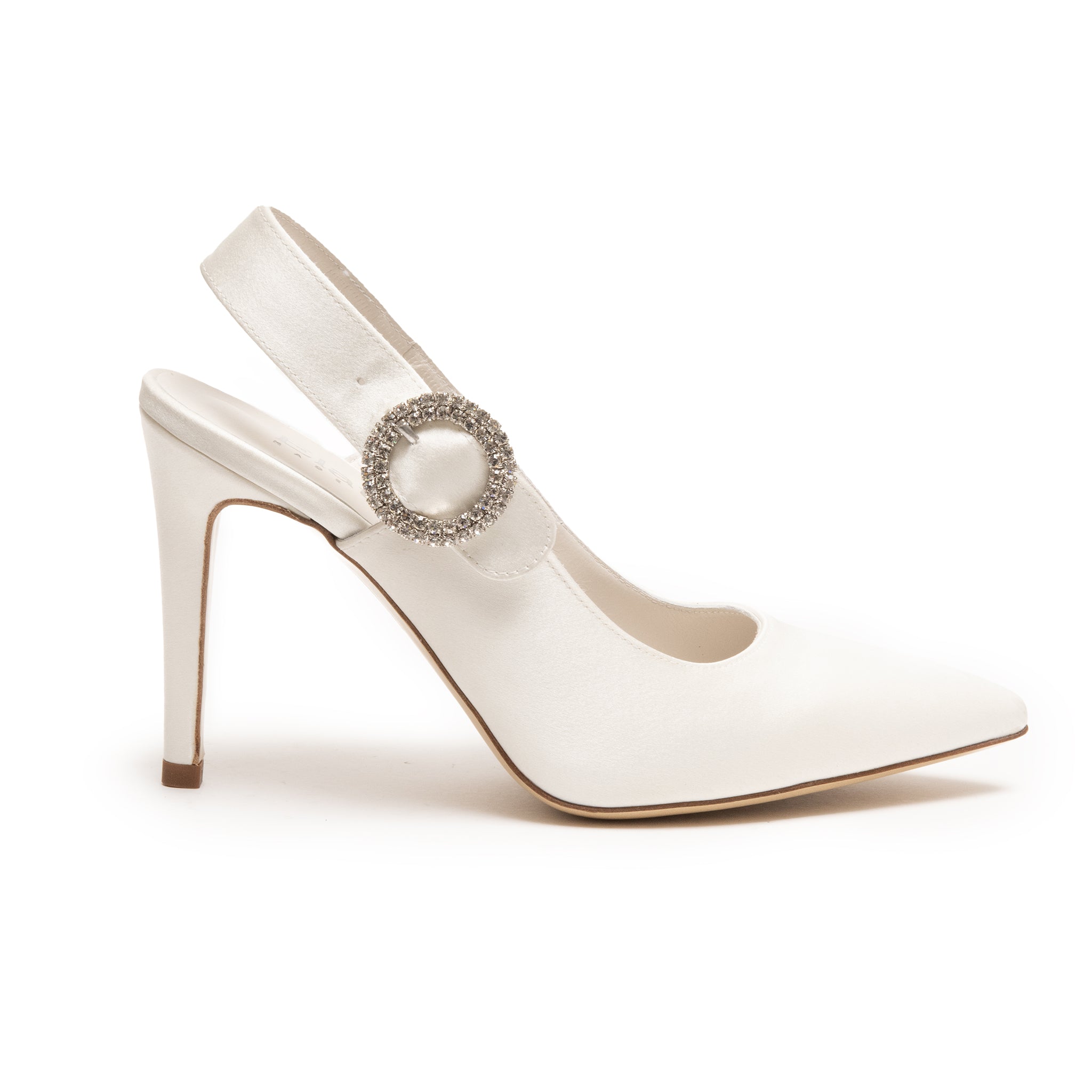 Questo décolleté in satin, impreziosito da una delicata fibbia laterale gioiello, cattura la luce, regalando un tocco luminoso e raffinato ad ogni passo.