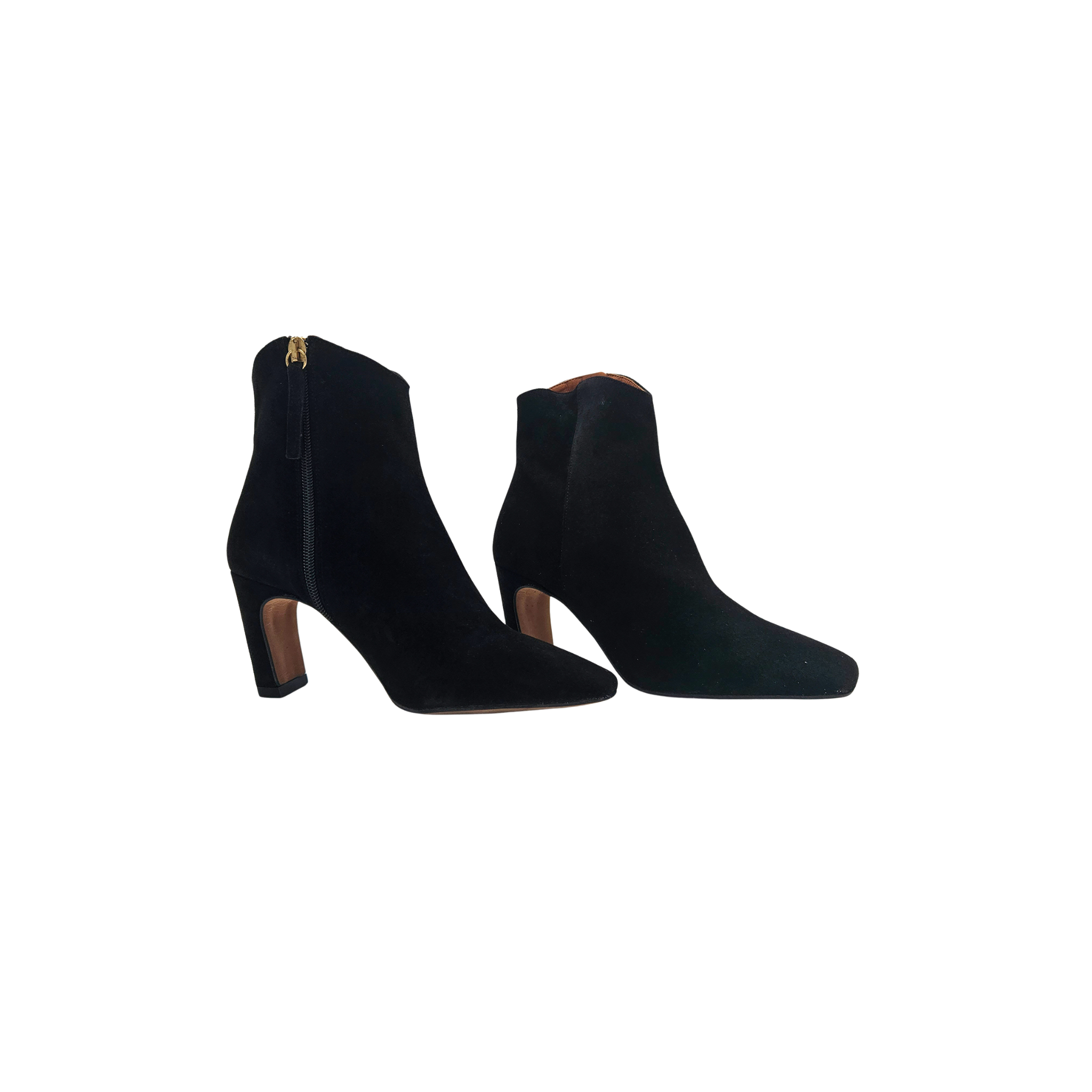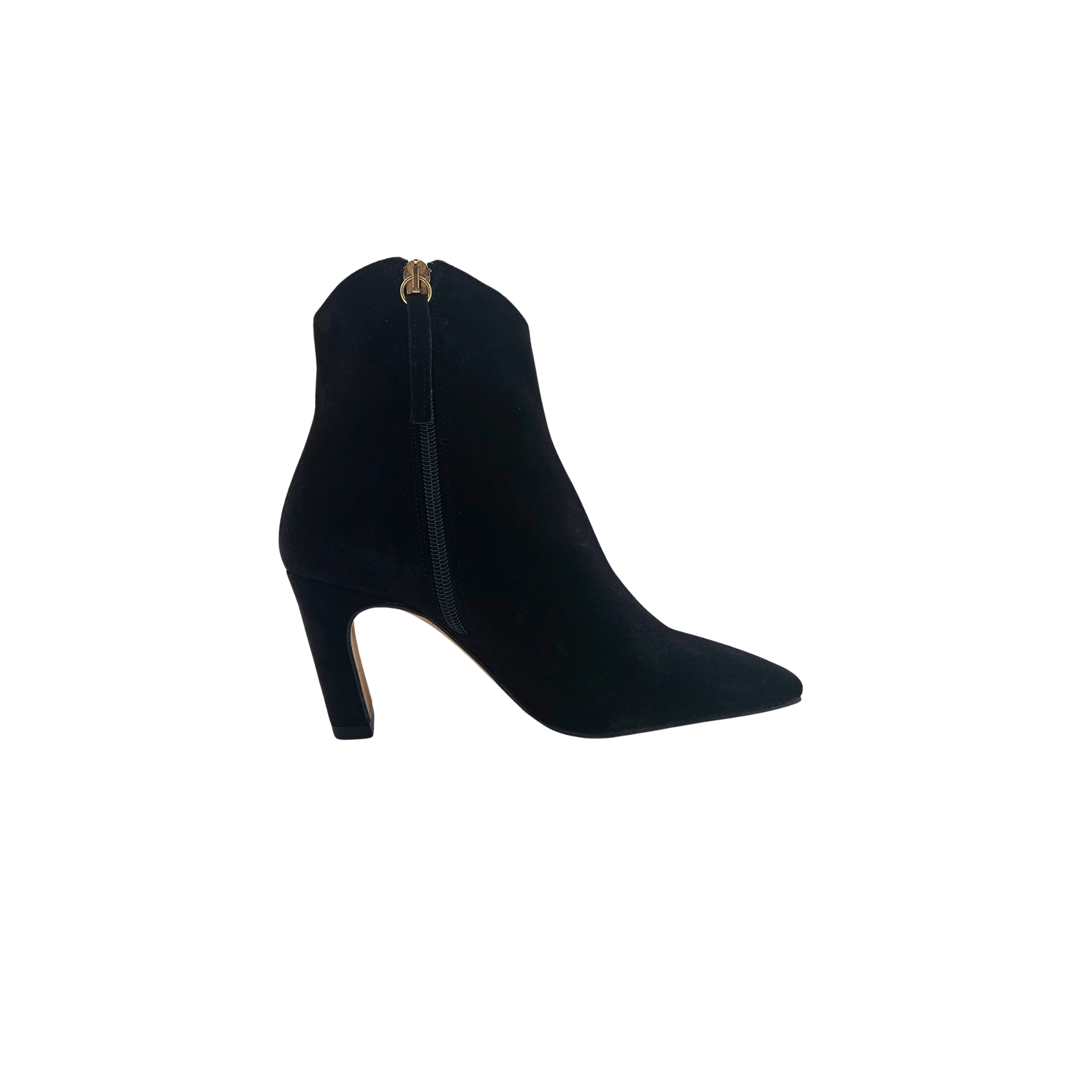 Stivaletto camoscio colore cuoio con tacco medio alto 7 cm con punta squadrata, in stile cowboy; zip laterale