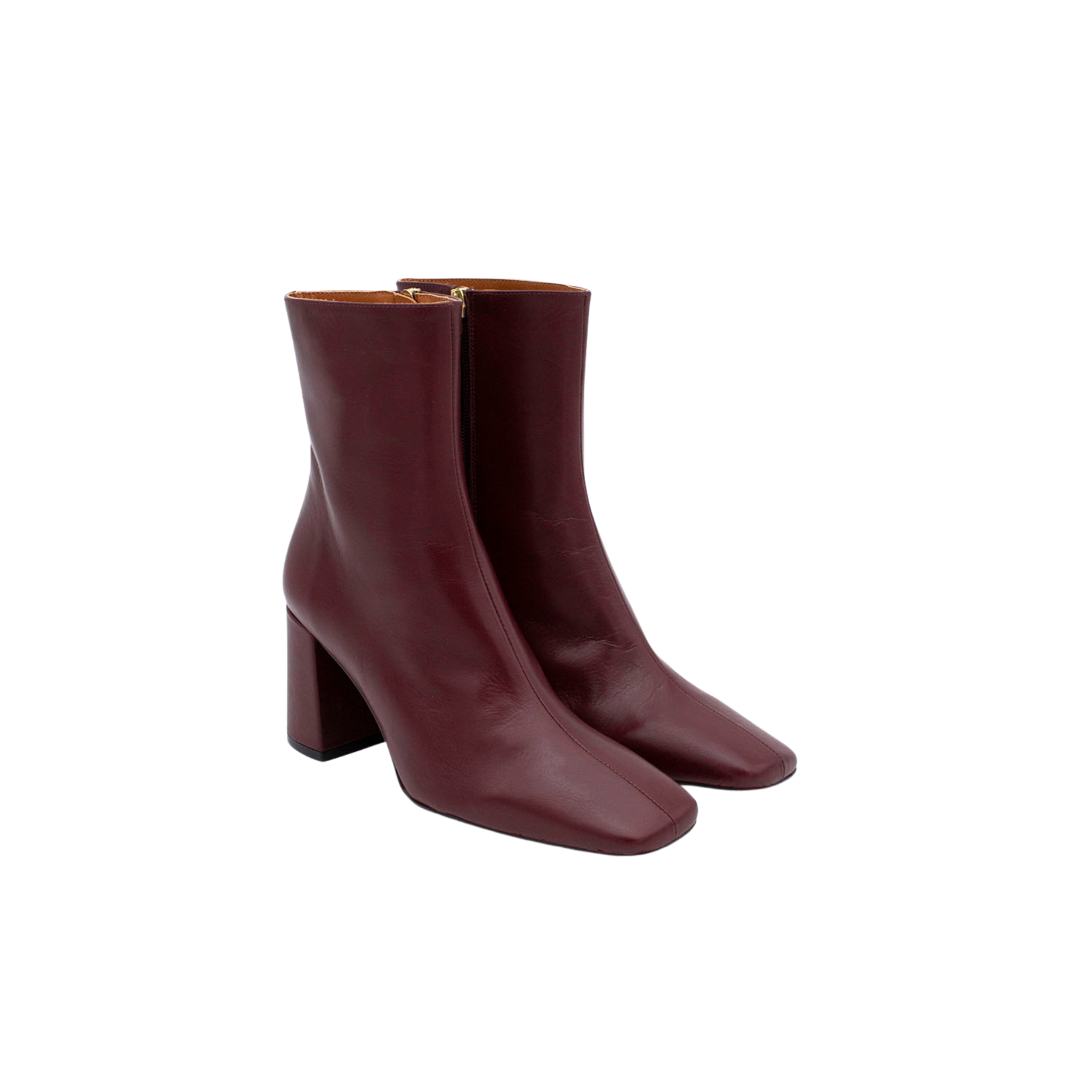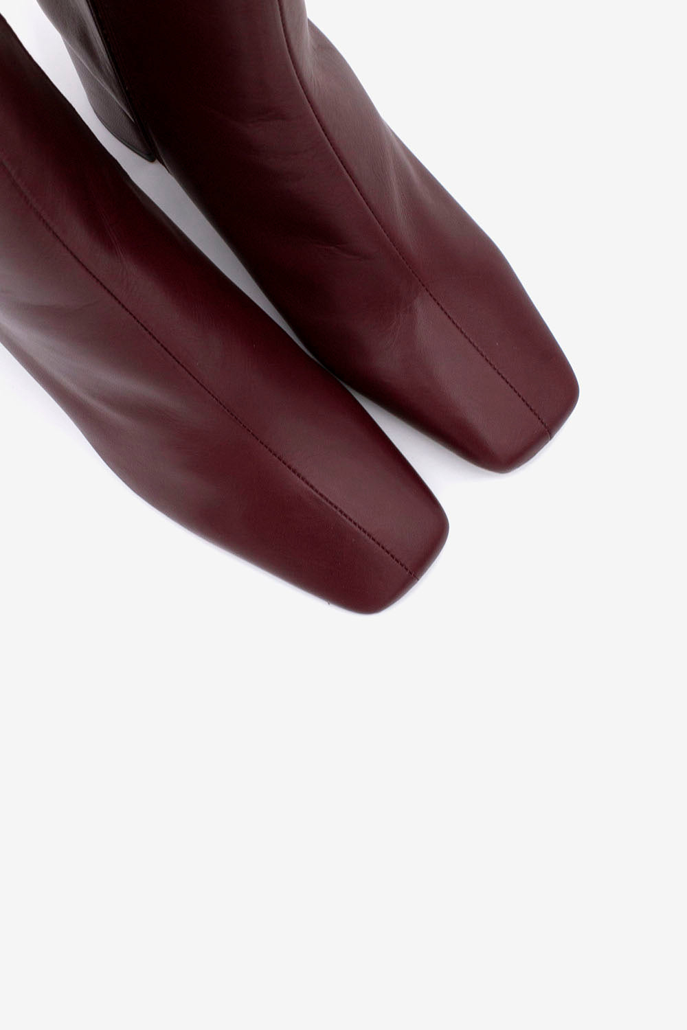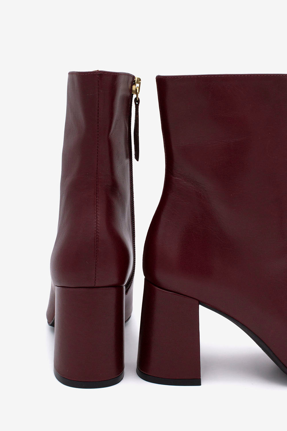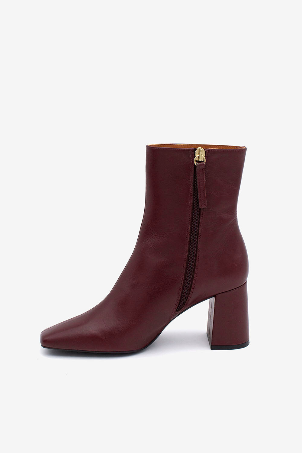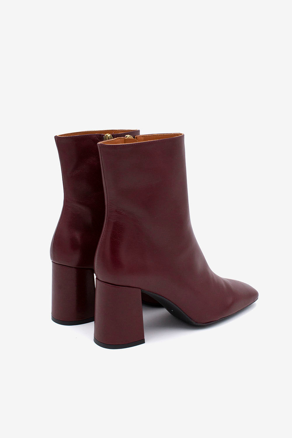 Tronchetto dalla punta squadrata realizzato in morbida pelle liscia, disponibile in due varianti colore: bordeaux e nero.