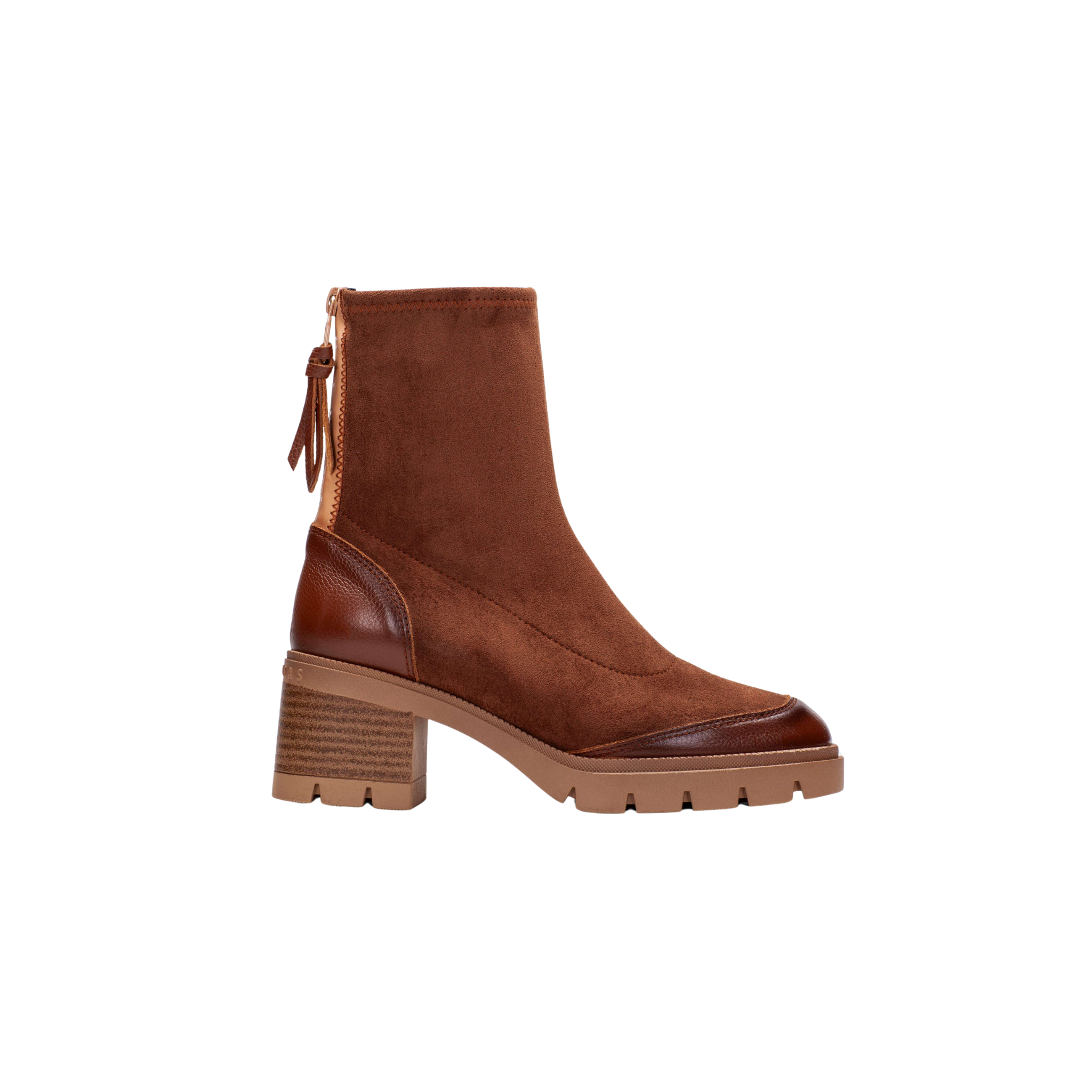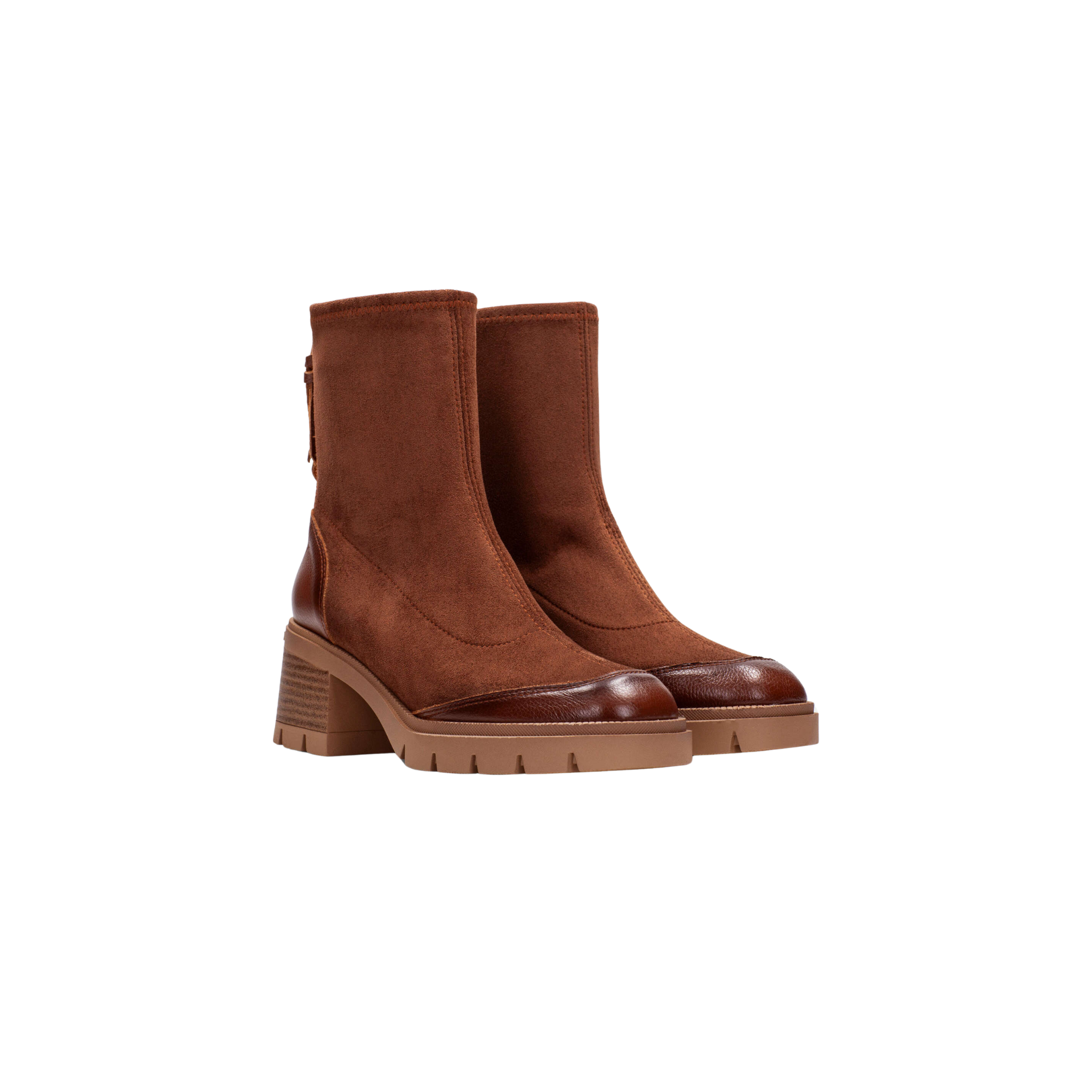 Stivaletto realizzato in tessuto elastico e pelle con suola track dalla punta tonda. Chiusura cerniera zip sul retro. Disponibile in 3 colori: nero, cuoio e bordeaux.