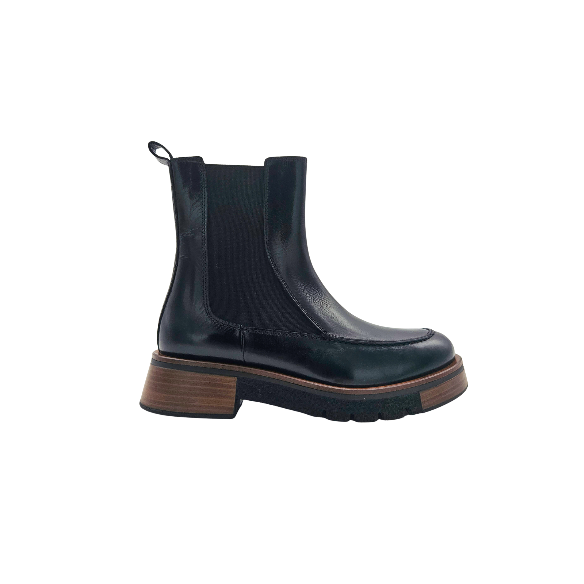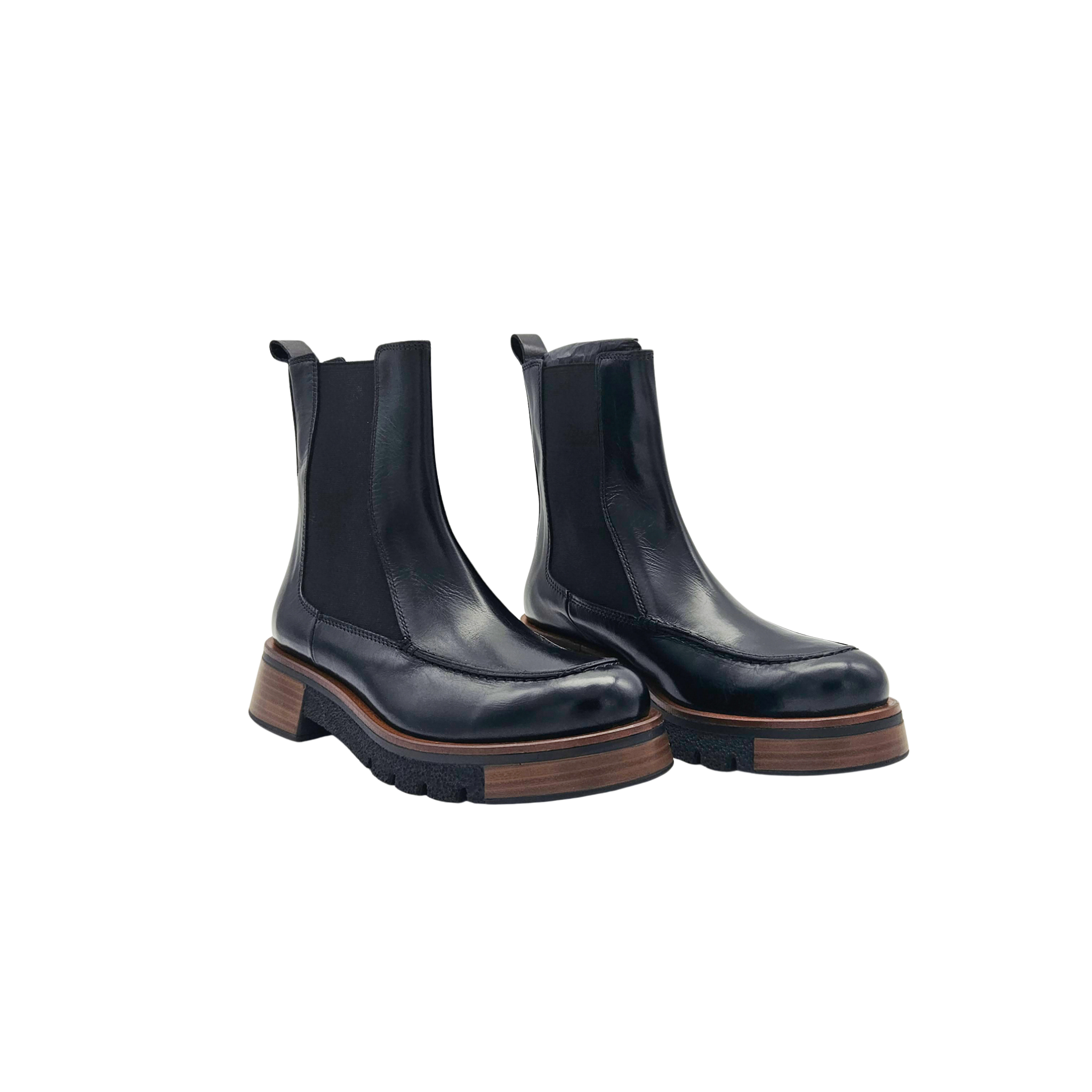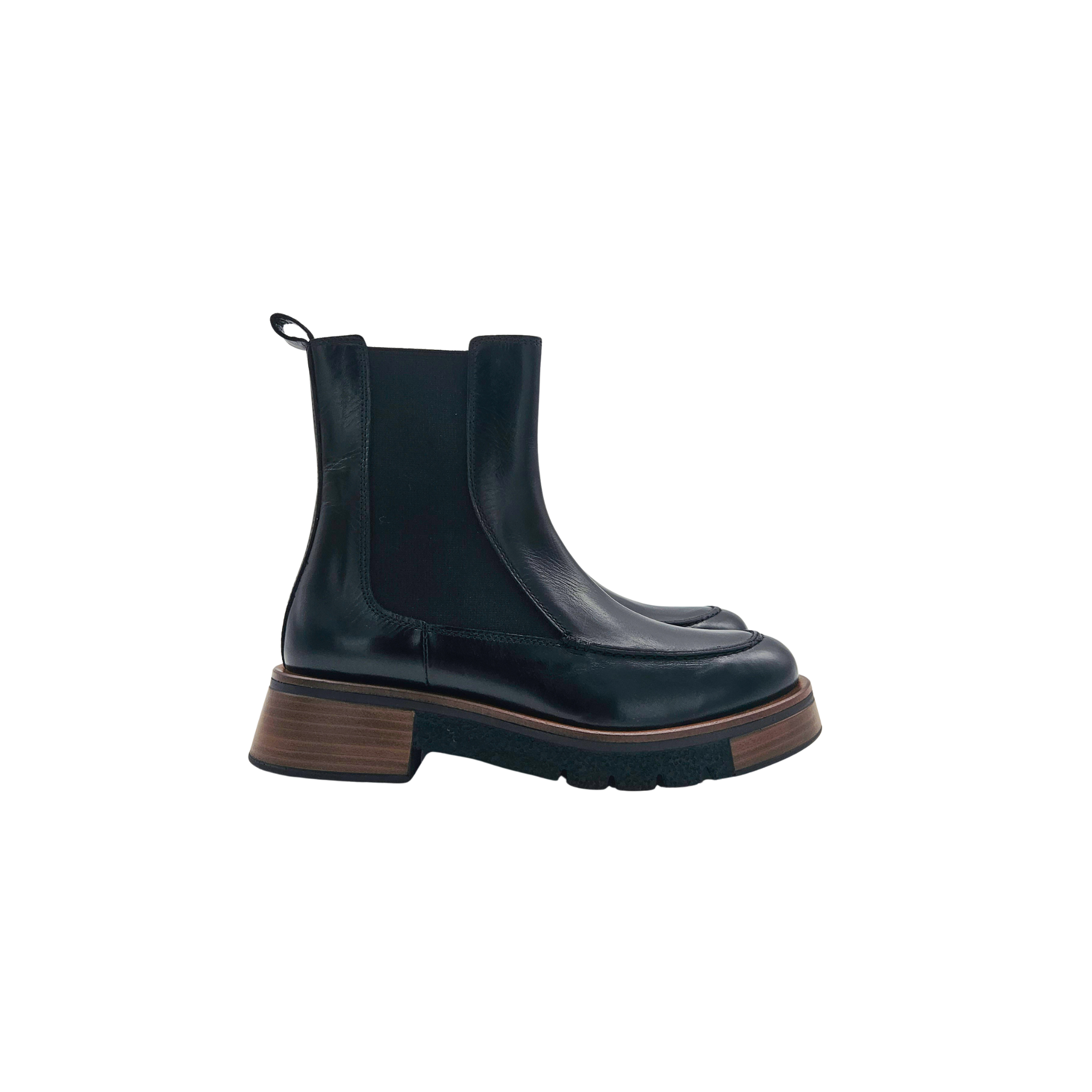 Stivaletto con plateau realizzato in pelle nepalese nera. Caratterizzato da una suola effetto legno che lo rende distintivo e raffinato.