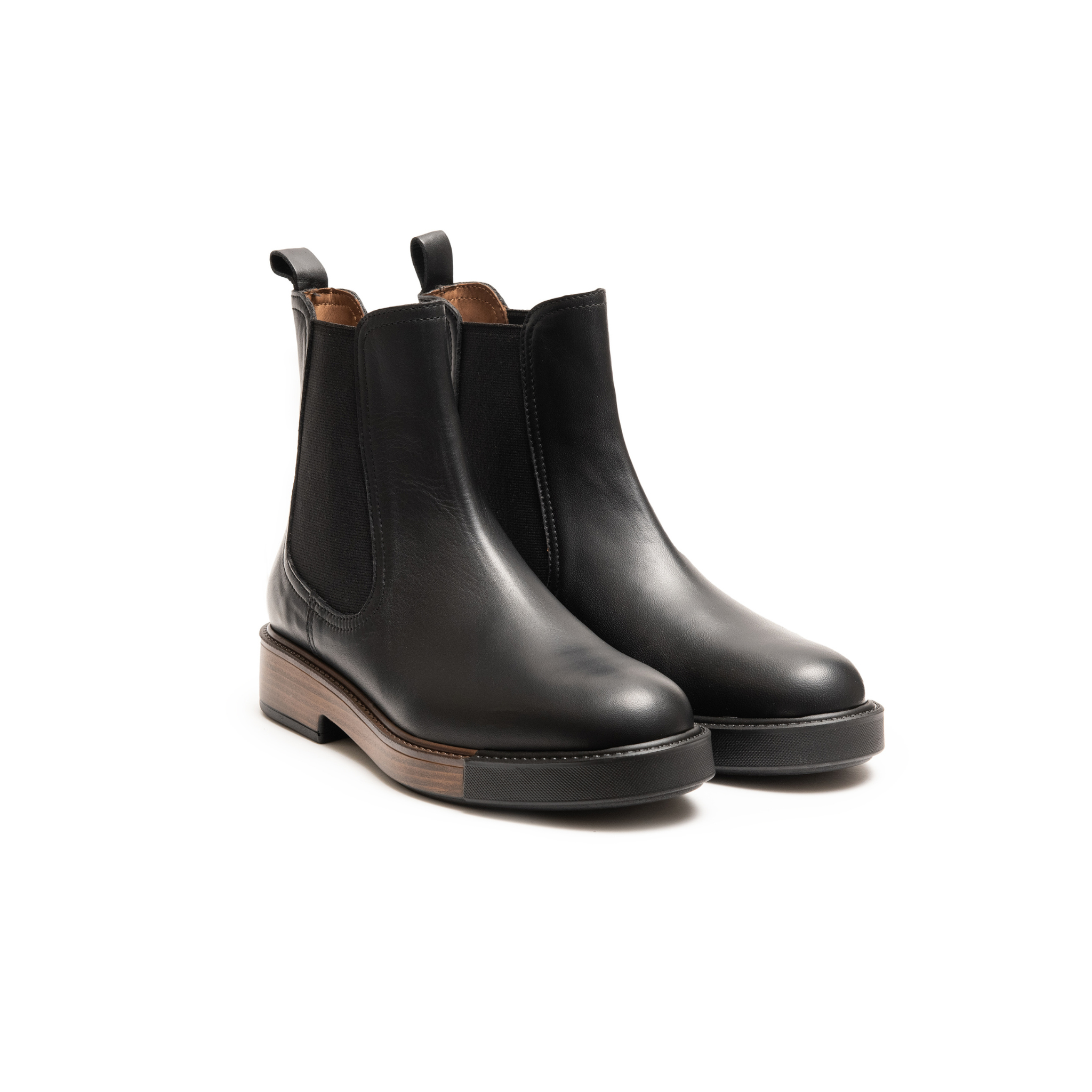 Stivaletto flat in morbida pelle nera, caratterizzato da una suola effetto legno che lo rende distintivo e raffinato.