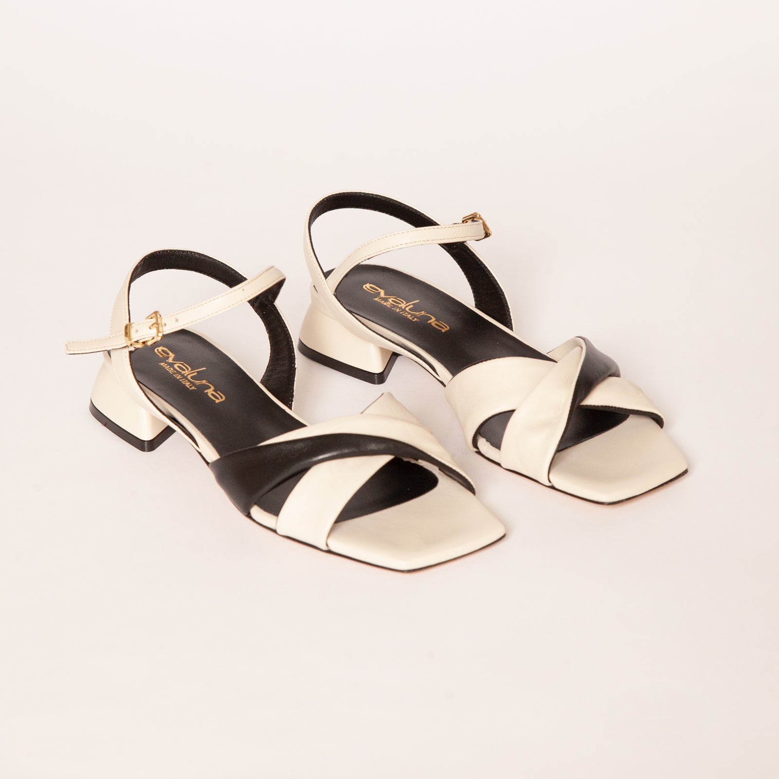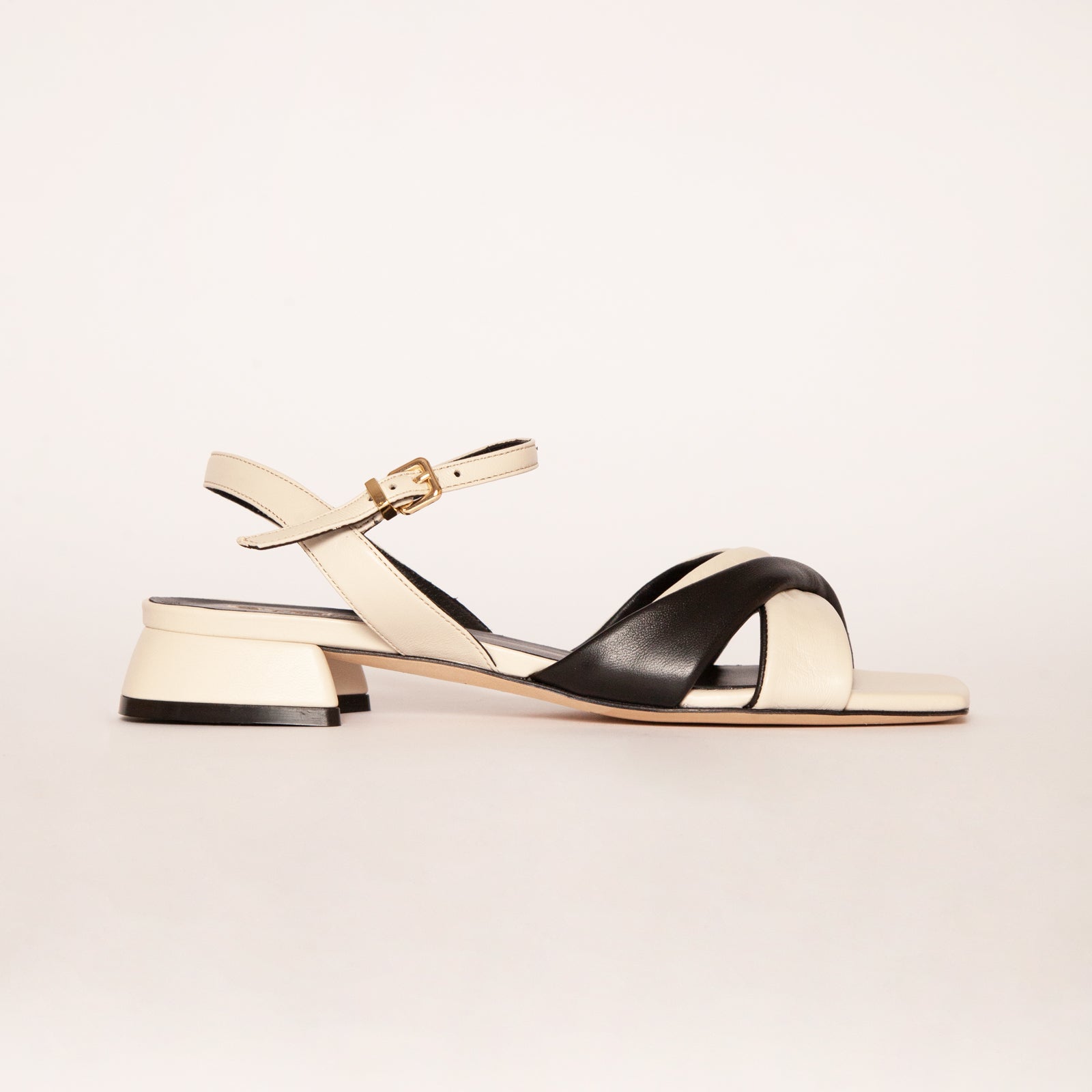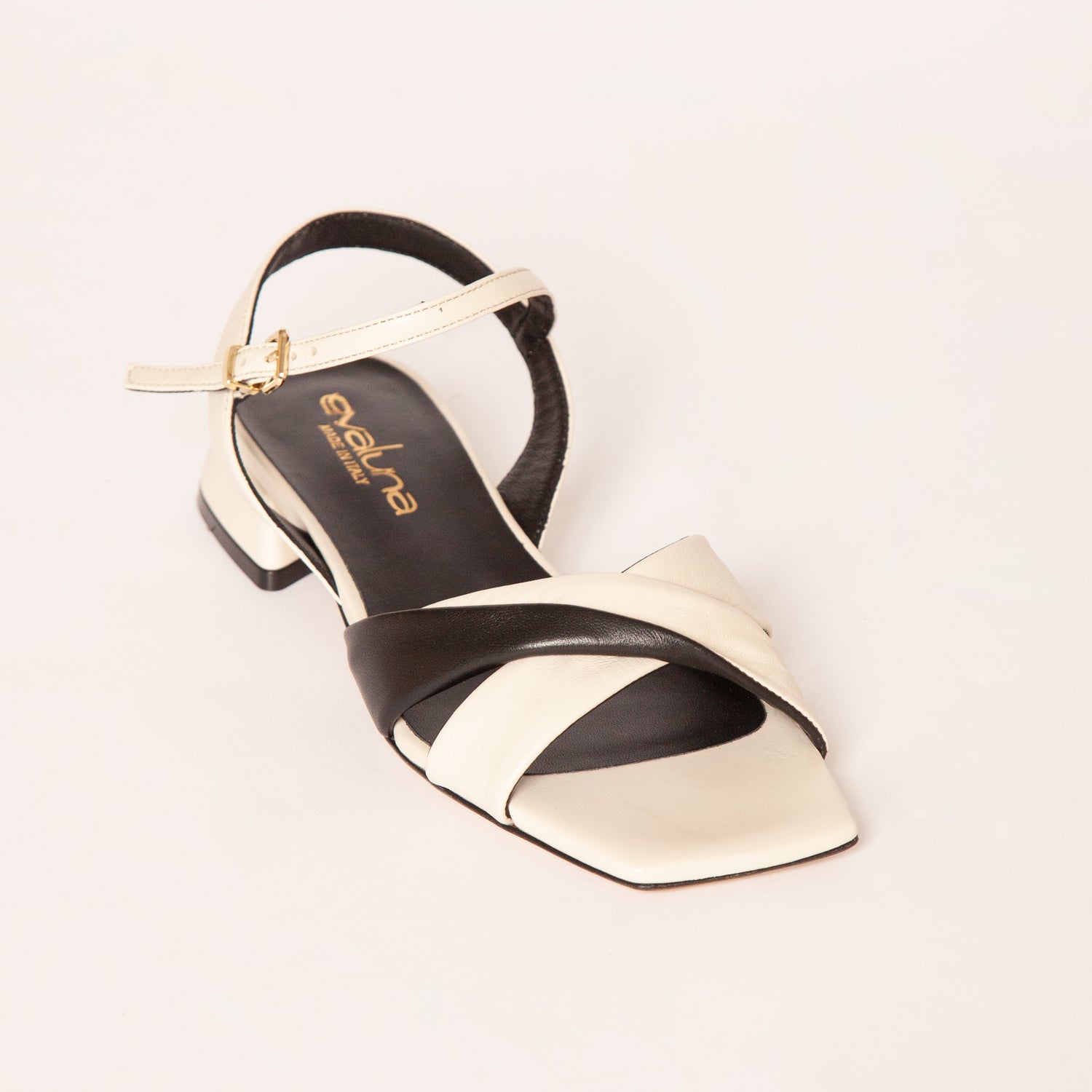 Sandalo basso bianco con fascia nera sul davanti. suola in cuoio cinturino con fibbia regolabile alla caviglia. Altezza tacco 2,5cm