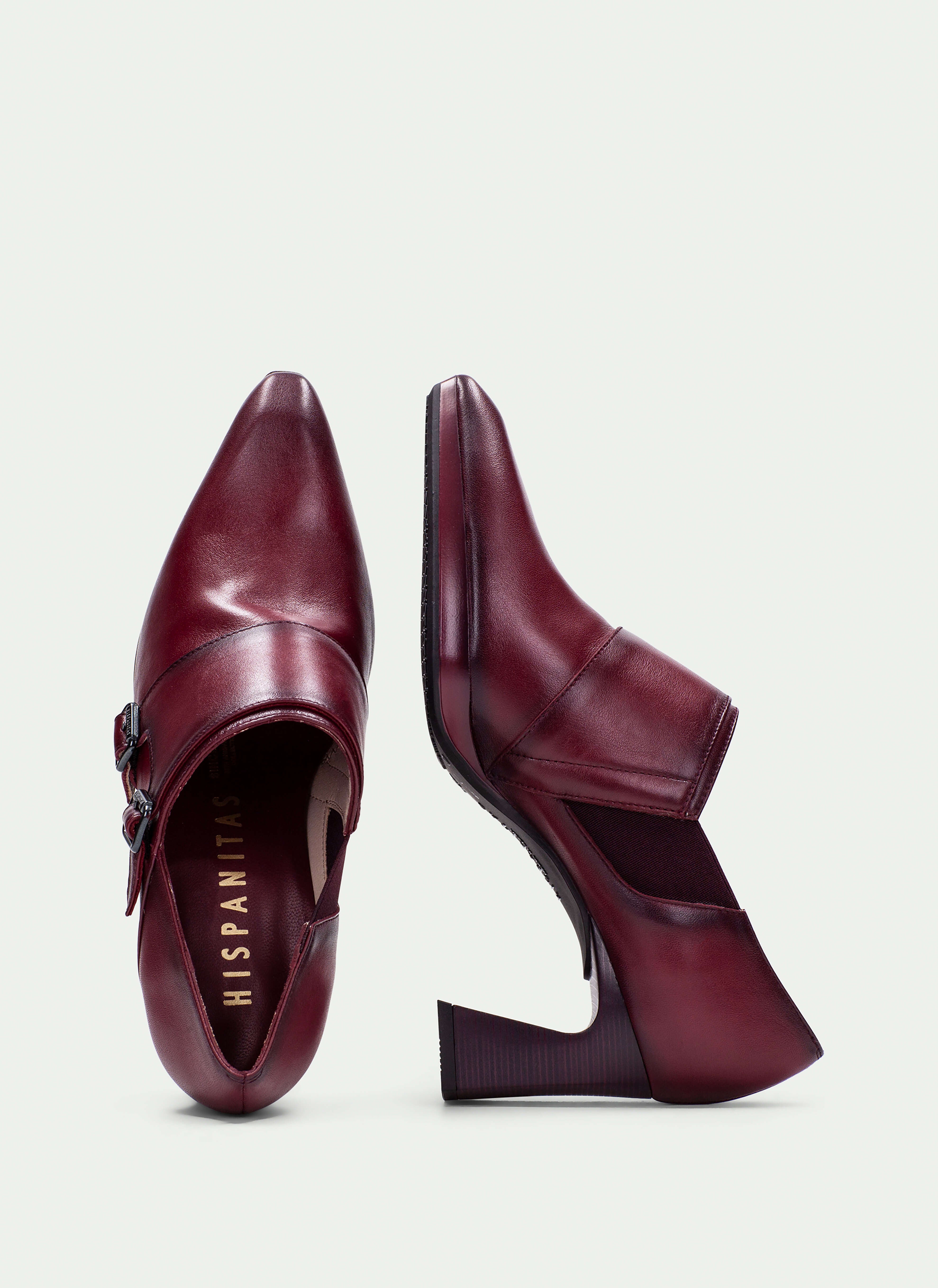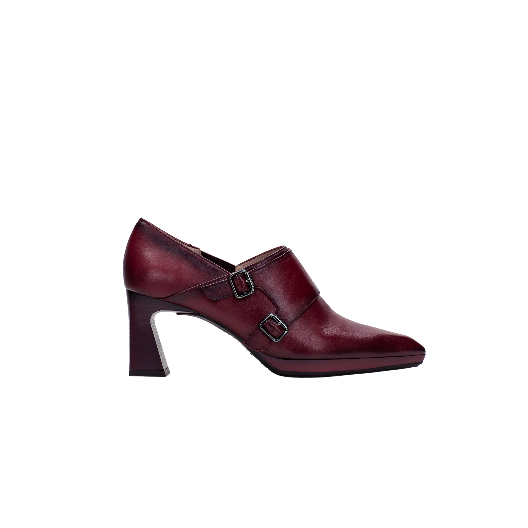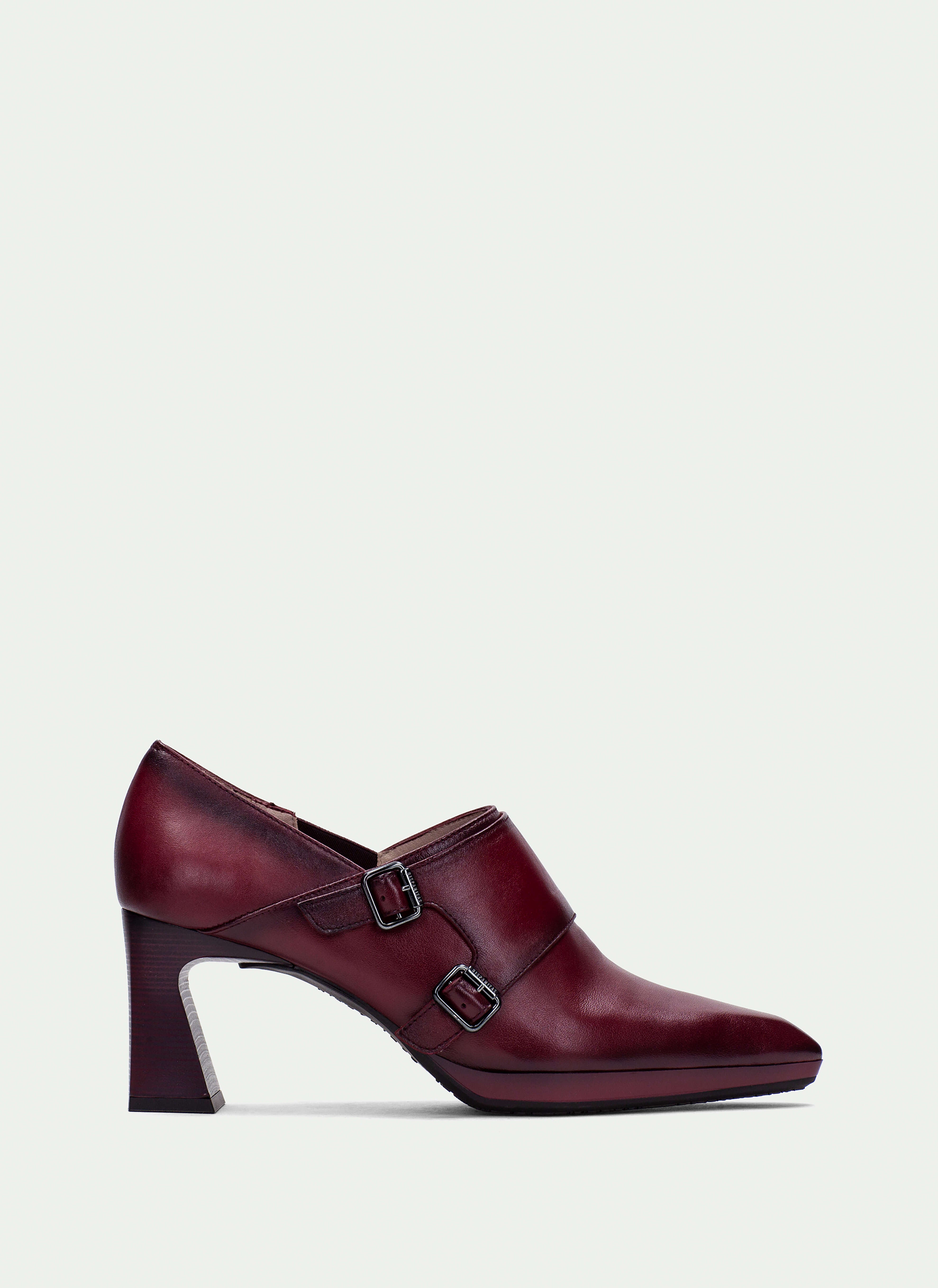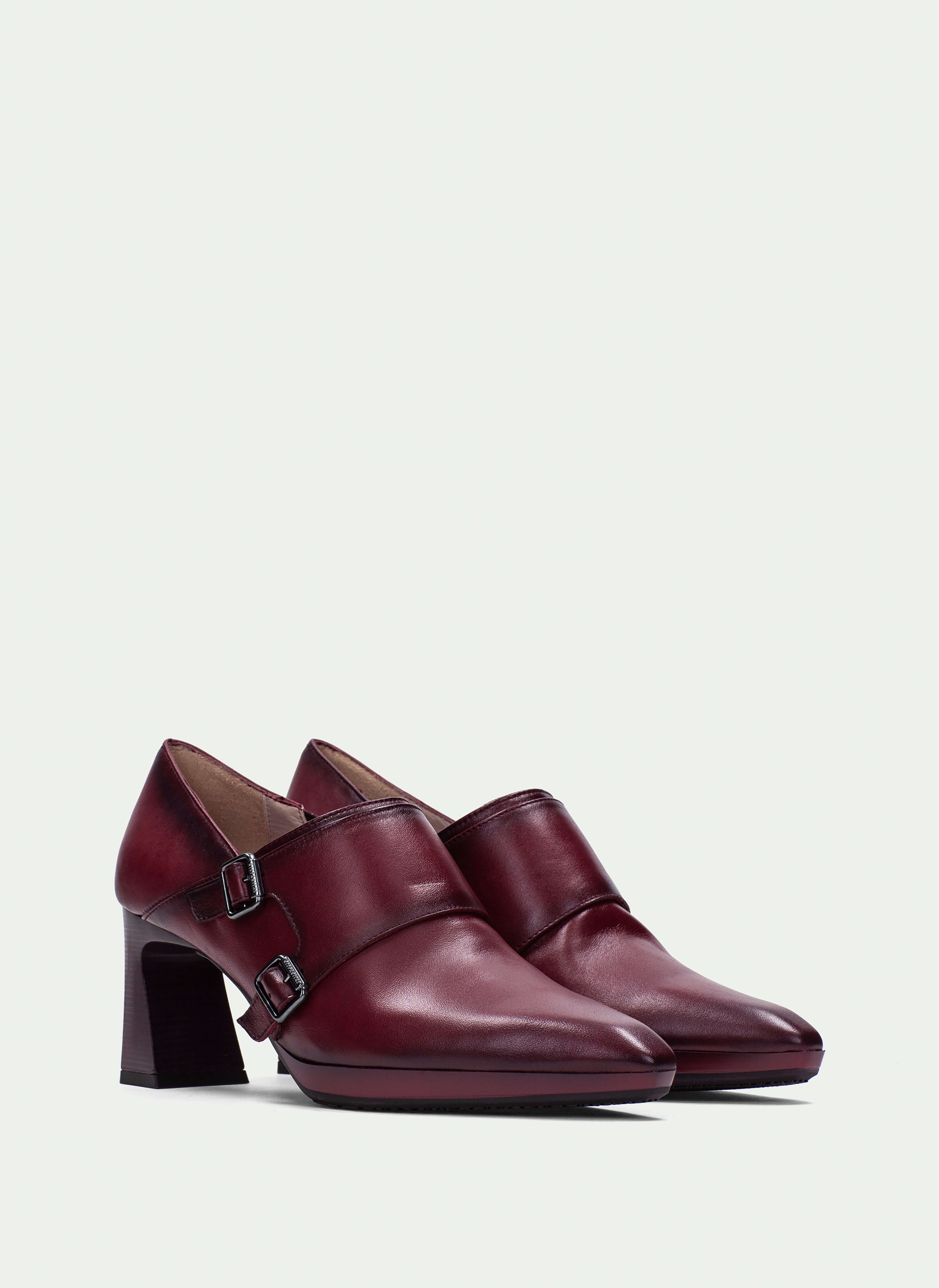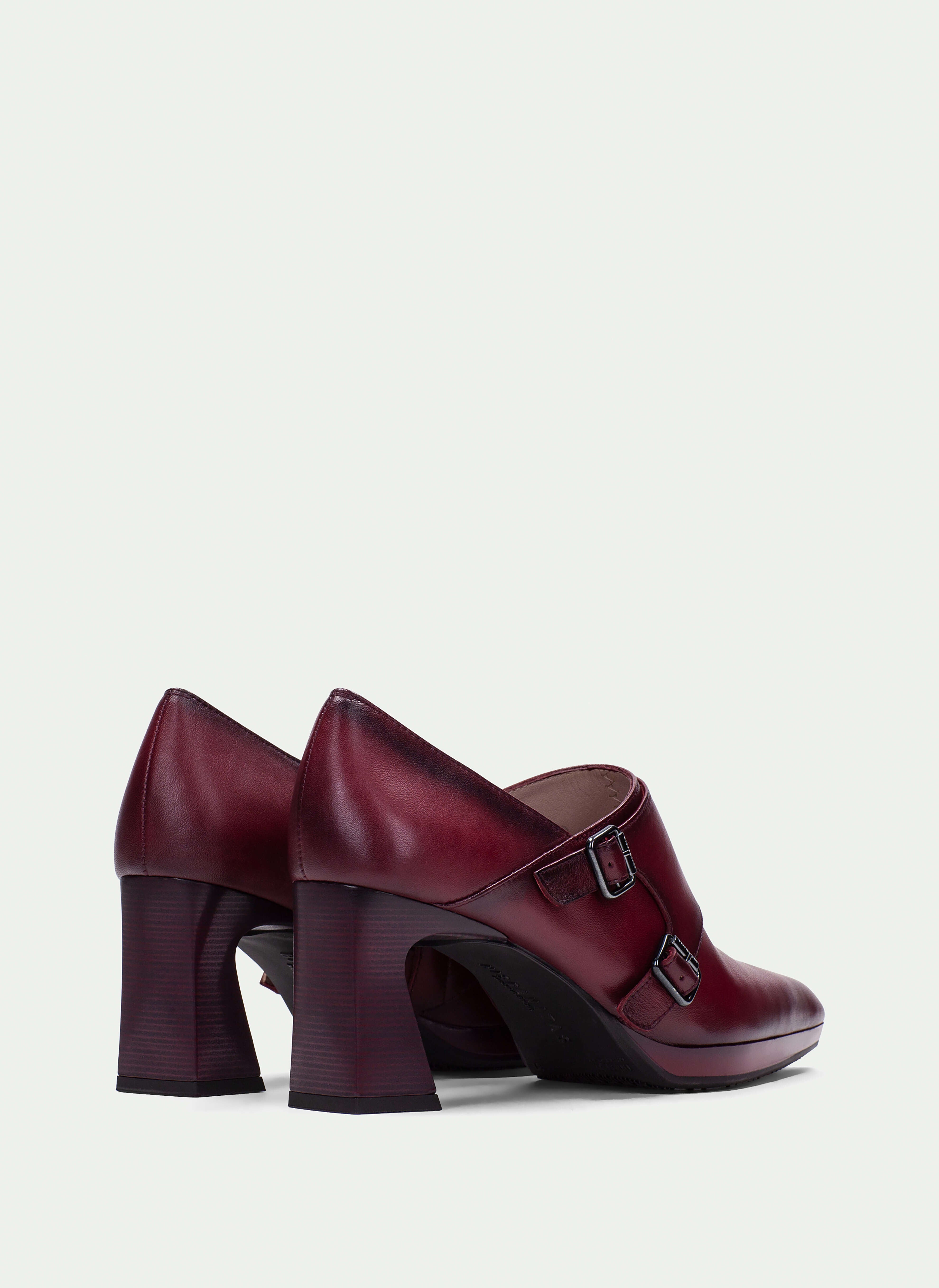 Modello in pelle liscia bordeaux con doppi cinturini con fibbie metalli che aggiungono carattere e un tocco sofisticato