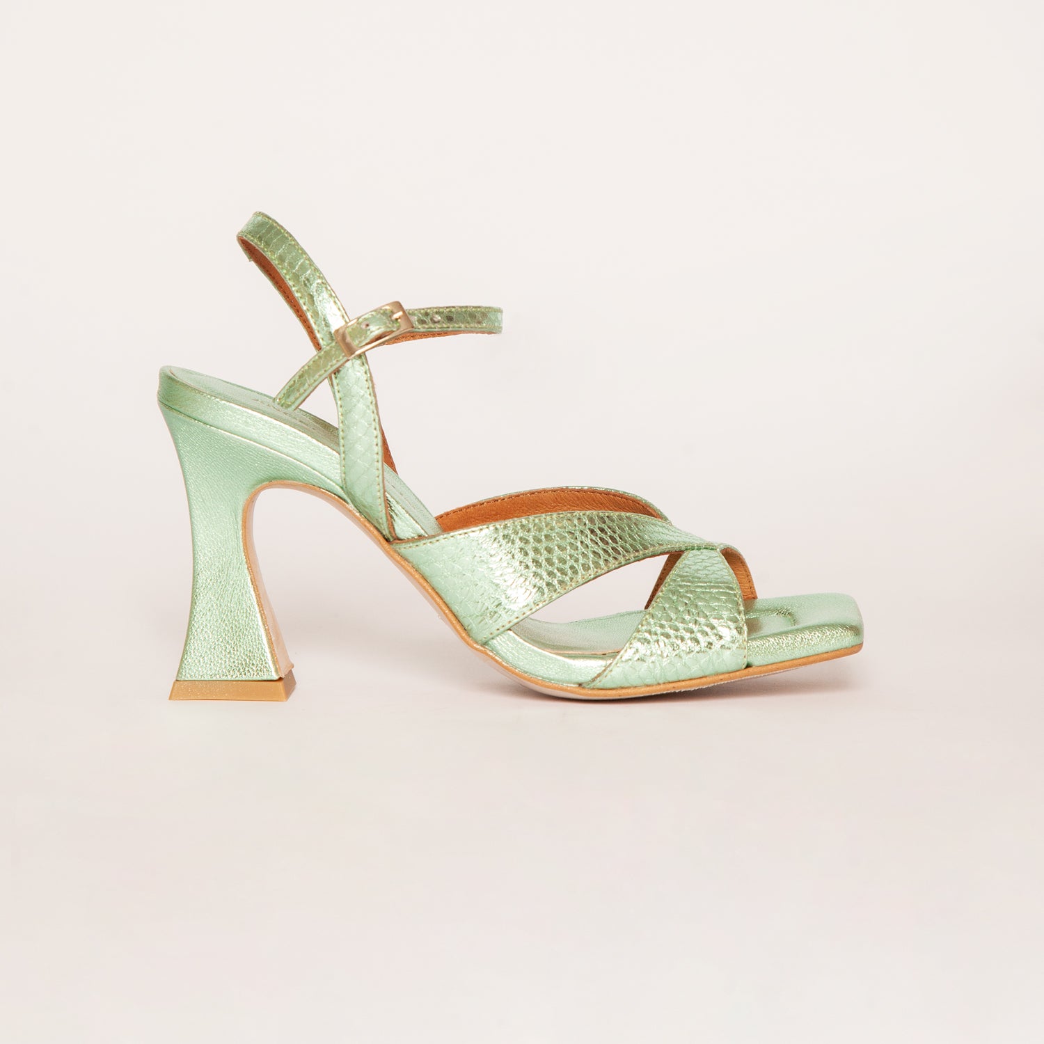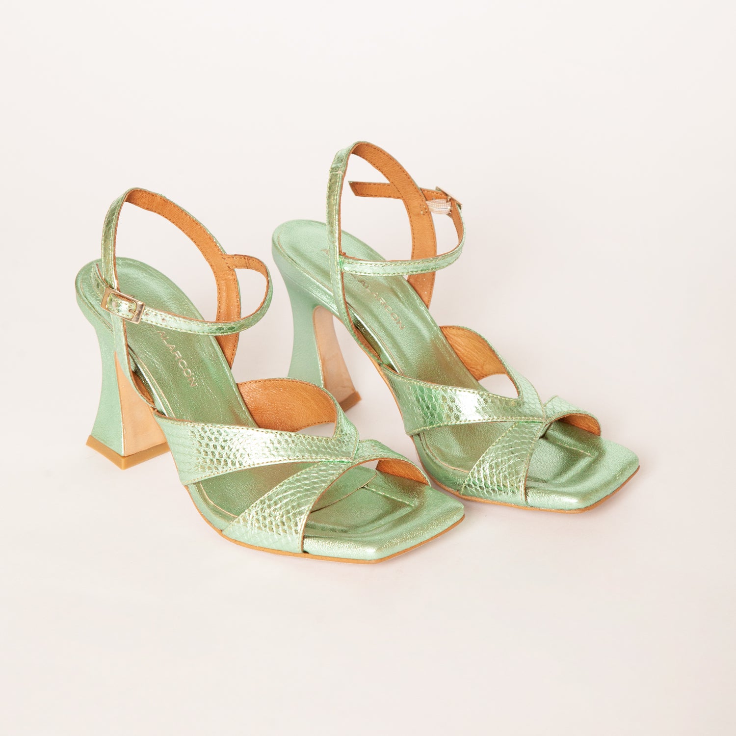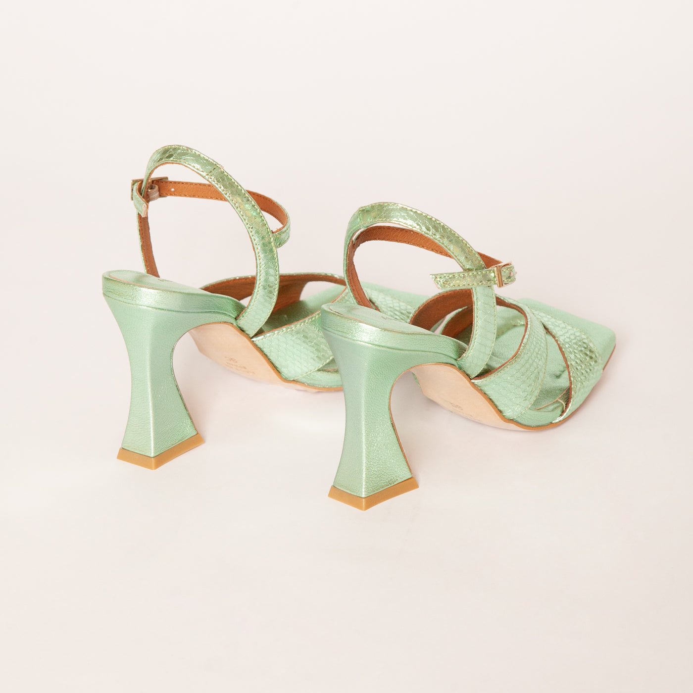 Altezza tacco 9,5. cinturino con fibbia regolabile. Fasce incrioiate sul davanti. Soletta imbottita