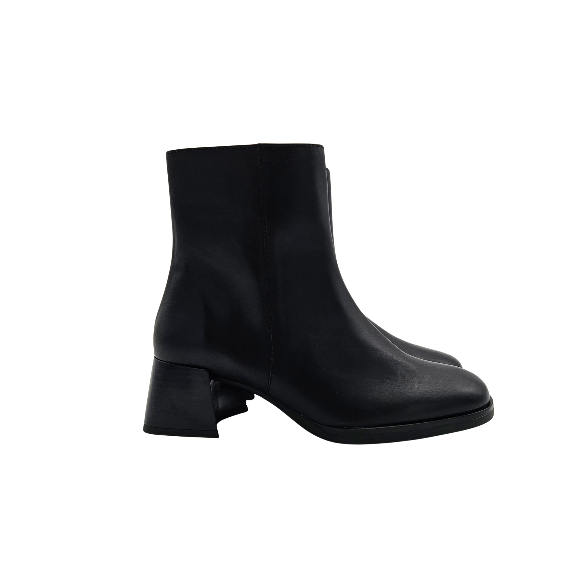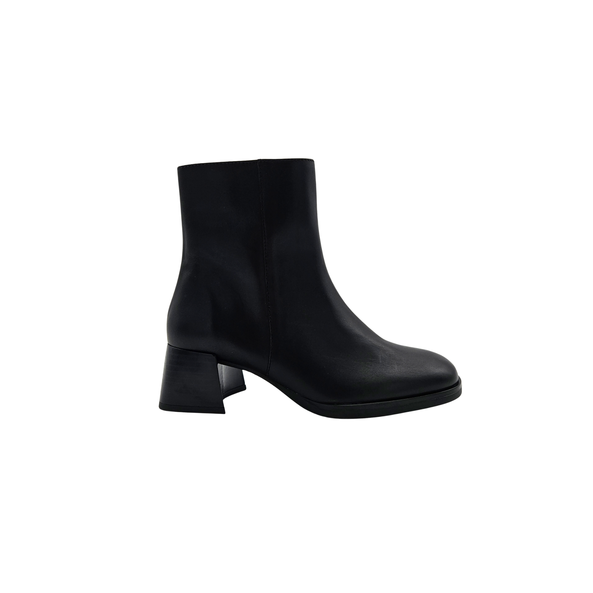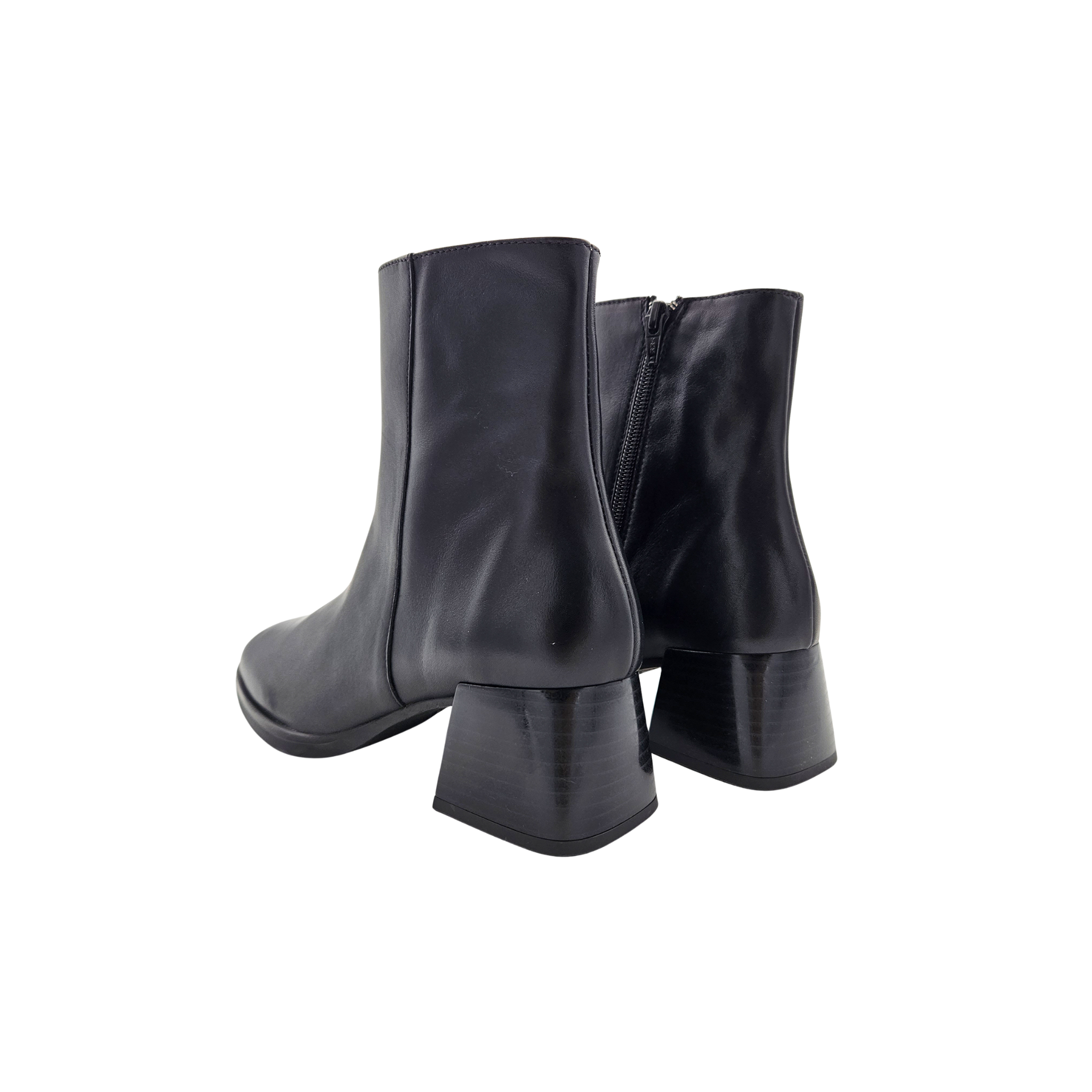 Stivaletto realizzato in pelle colore nero, punta arrotondata e tacco largo antiscivolo. Chiusura zip su lato interno.