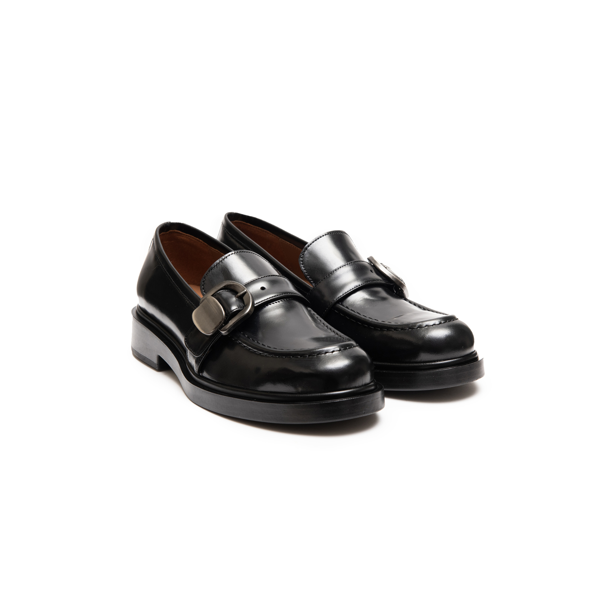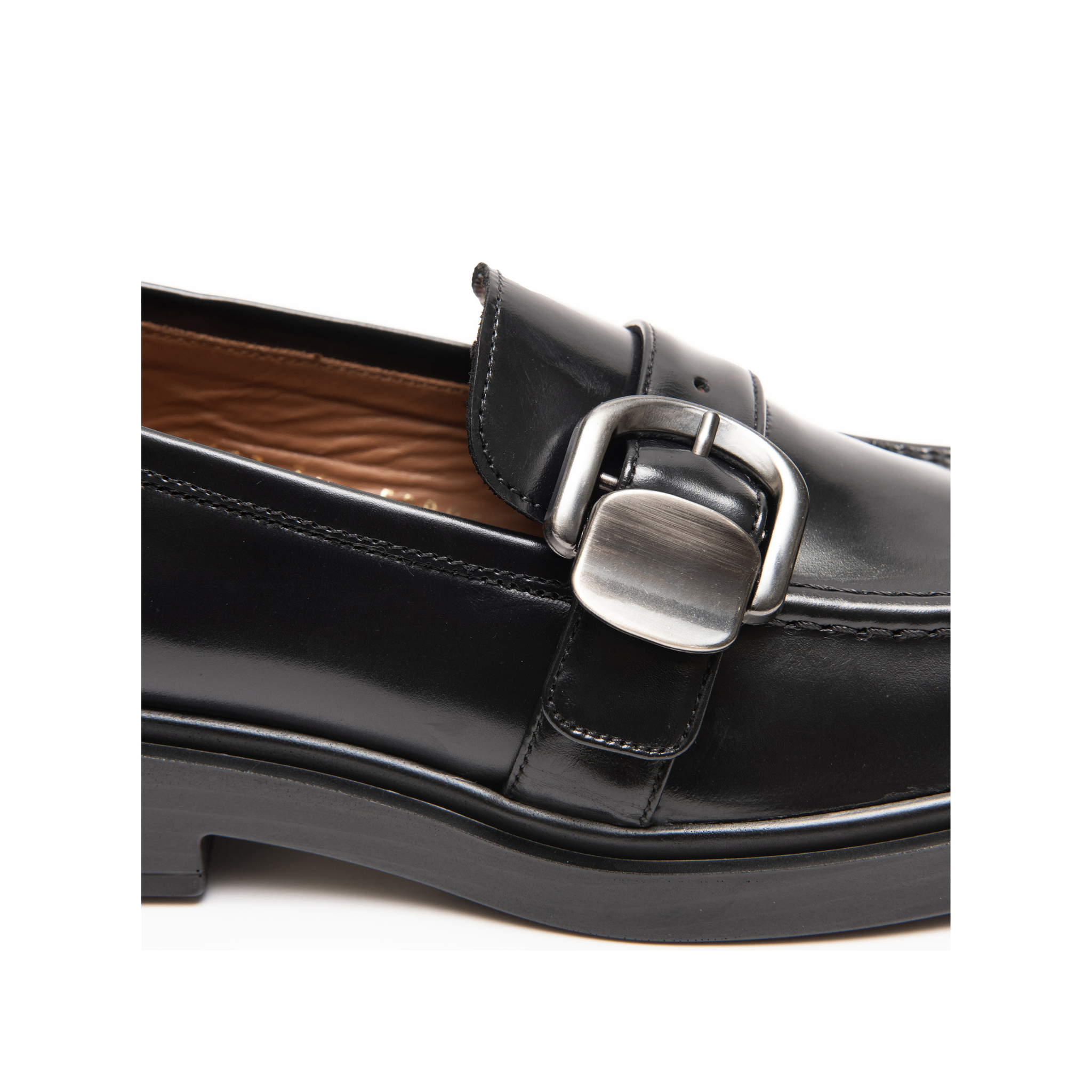 Mocassino in pelle colore nero firmato Pons Quintana. Design classico e contemporaneo. Caratterizzato da una fibbia in metallo satinato sul collo del piede, dona un tocco distintivo.