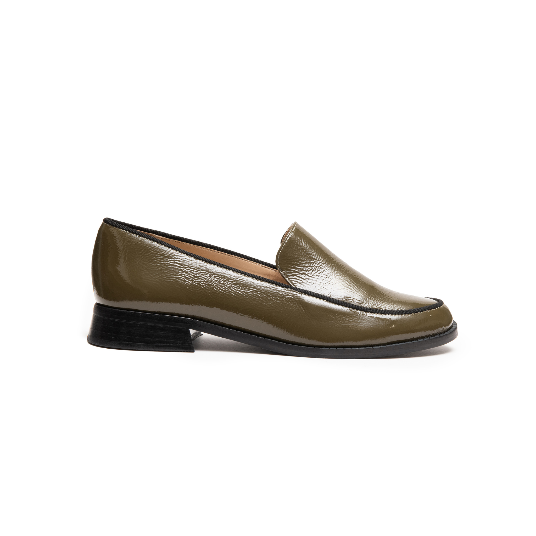 Mocassino classico in pelle lucida colore verde oliva, dal design essenziale e raffinato.
