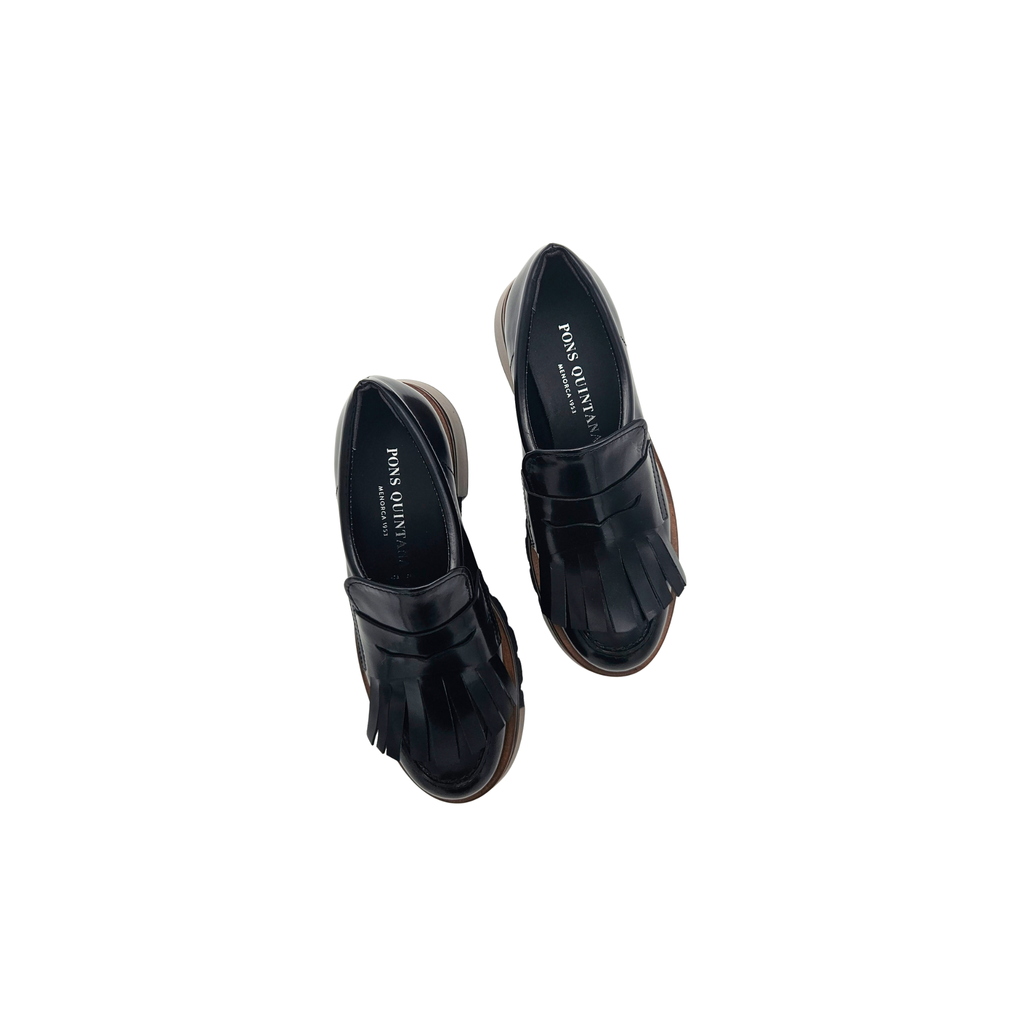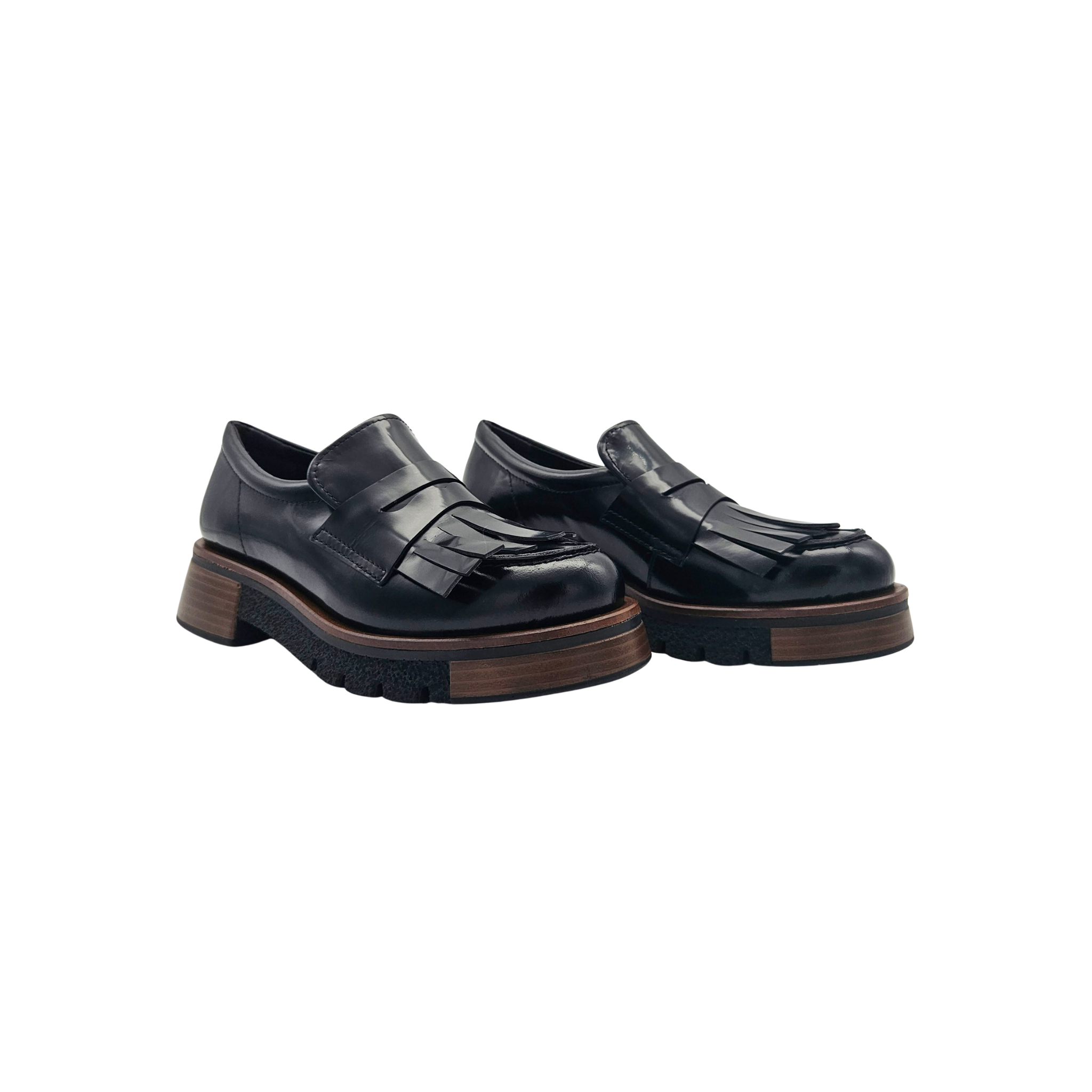 Mocassino Mali con frange e plateau realizzato in morbida pelle nepalese colore nero.