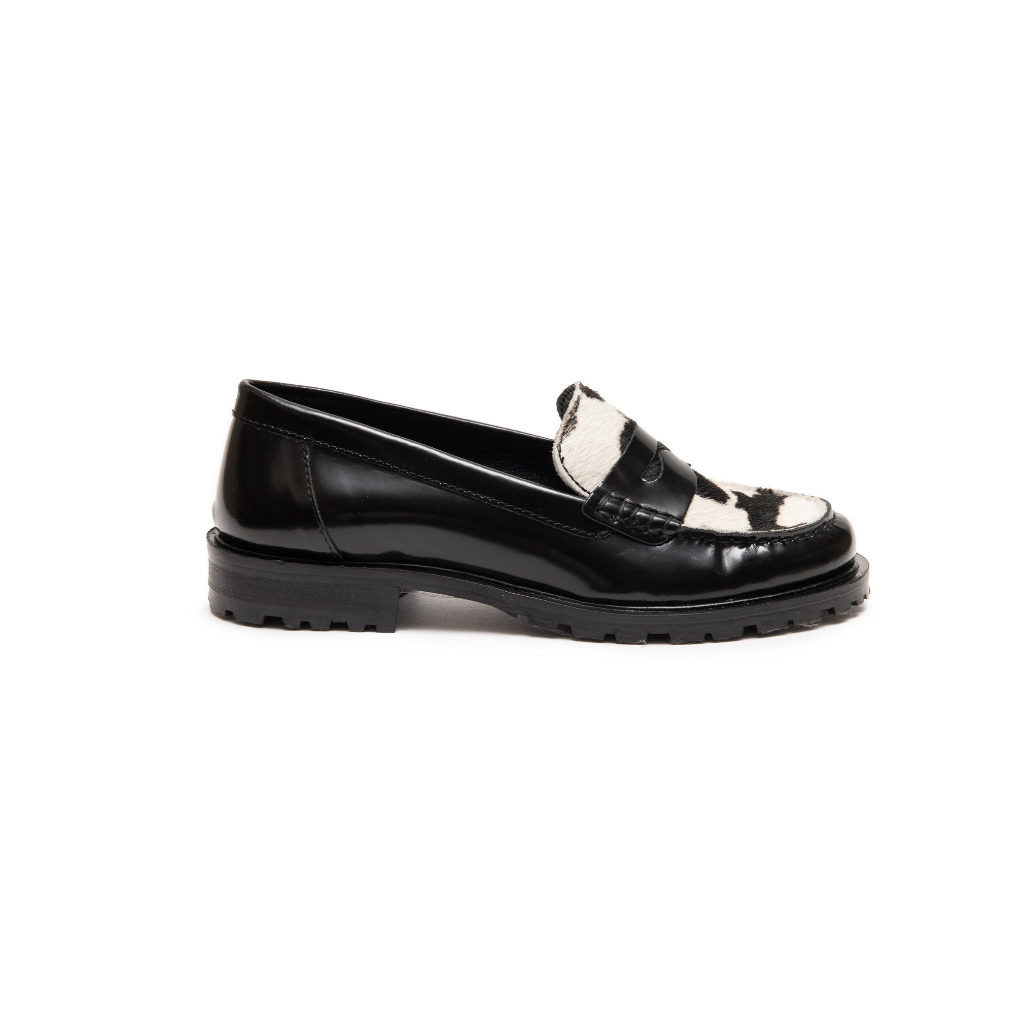 Mocassino in pelle con dettaglio in cavallino stampa animalier : grintoso e fuori dagli schemi.