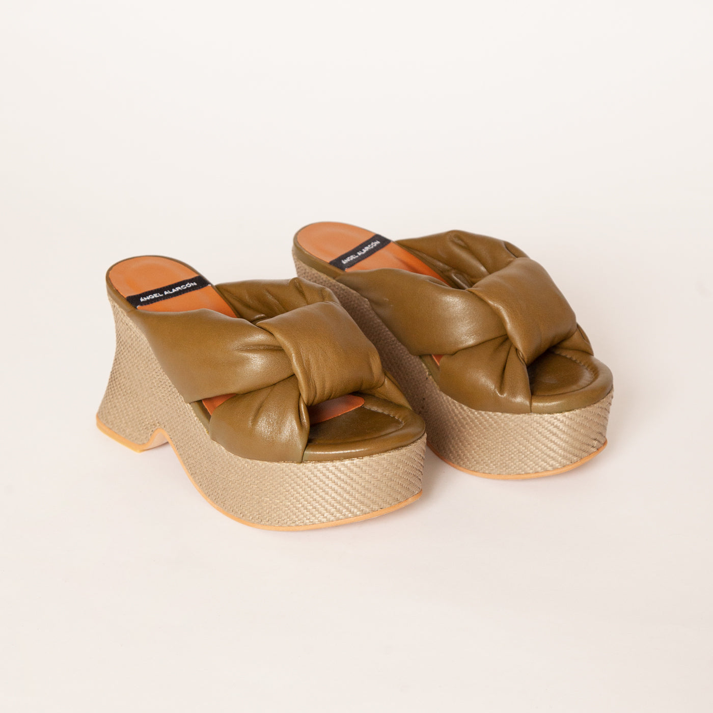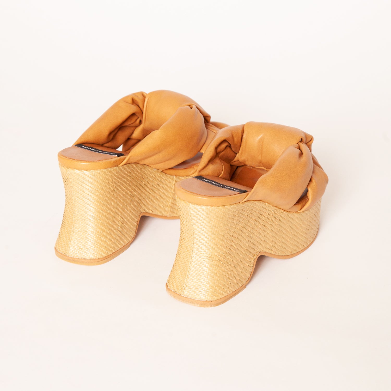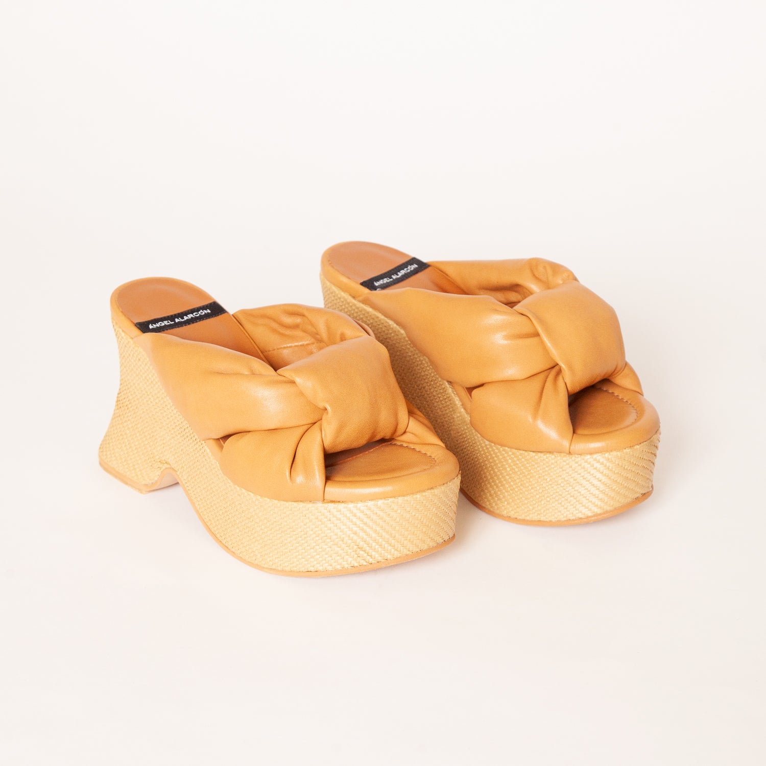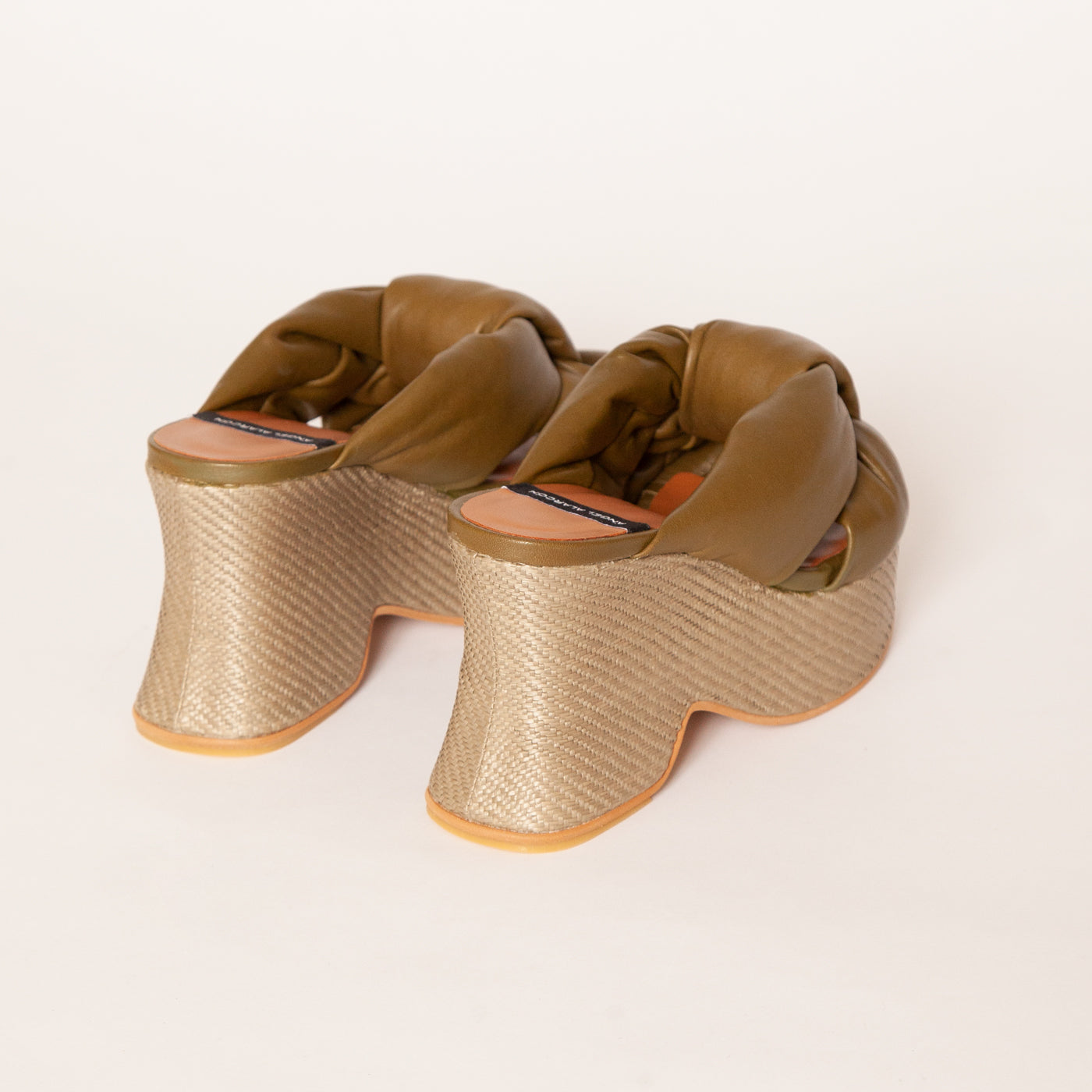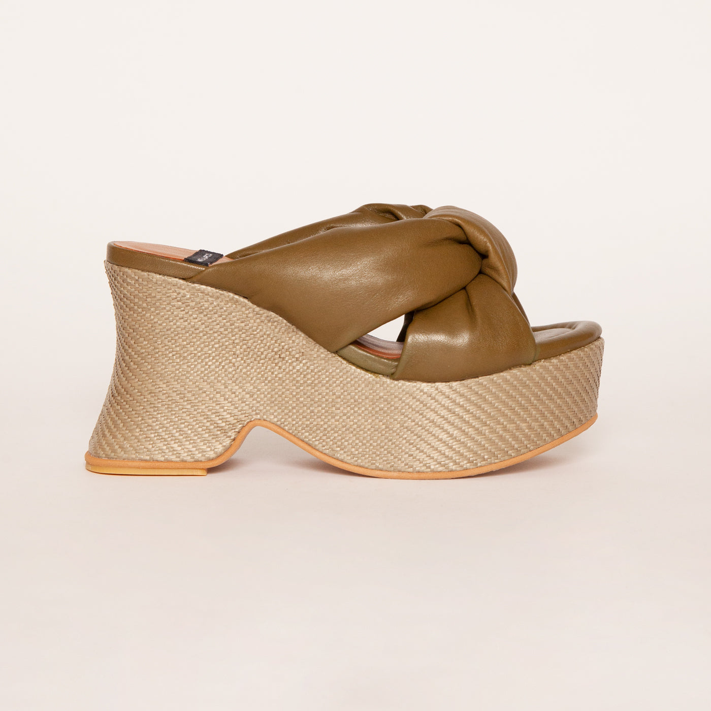 Tacco zeppa in rafia. Pelle e rafia. Sul davanti 5cm. Tacco 9cm