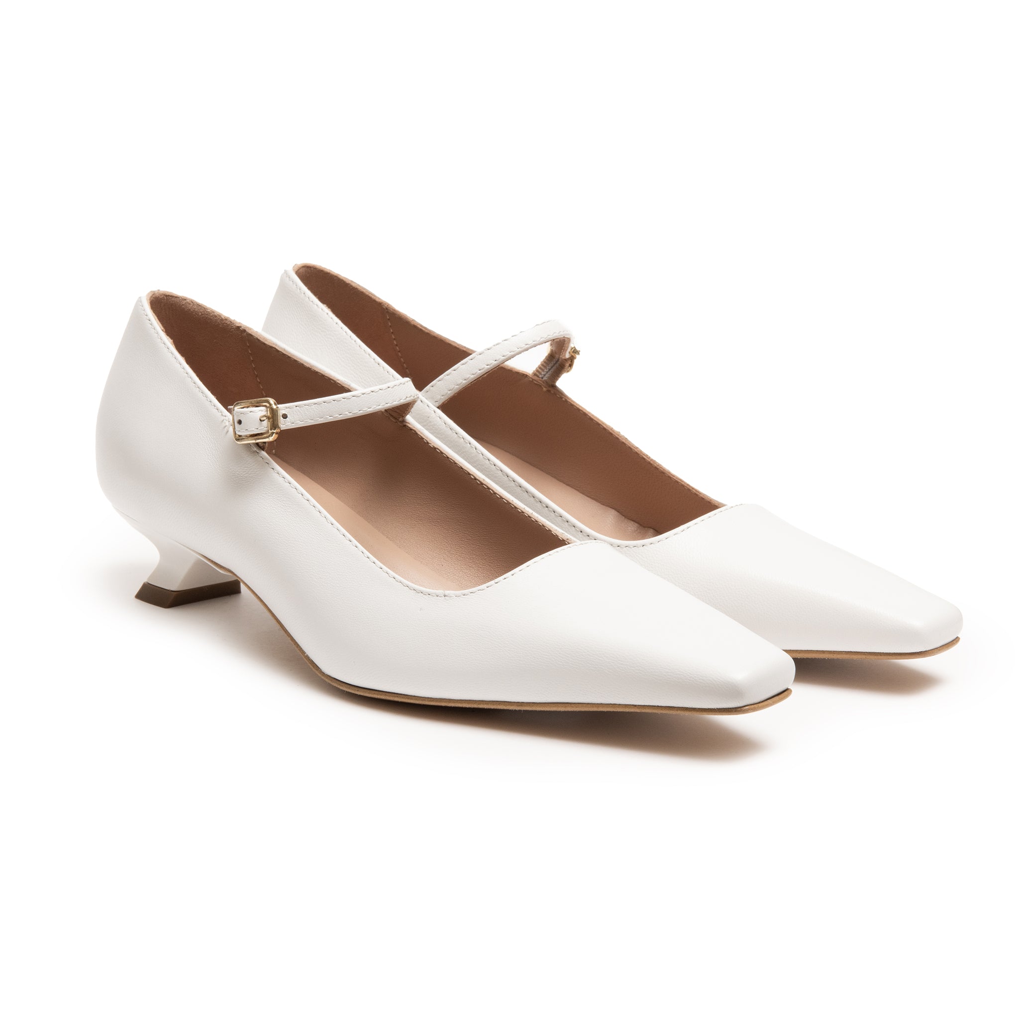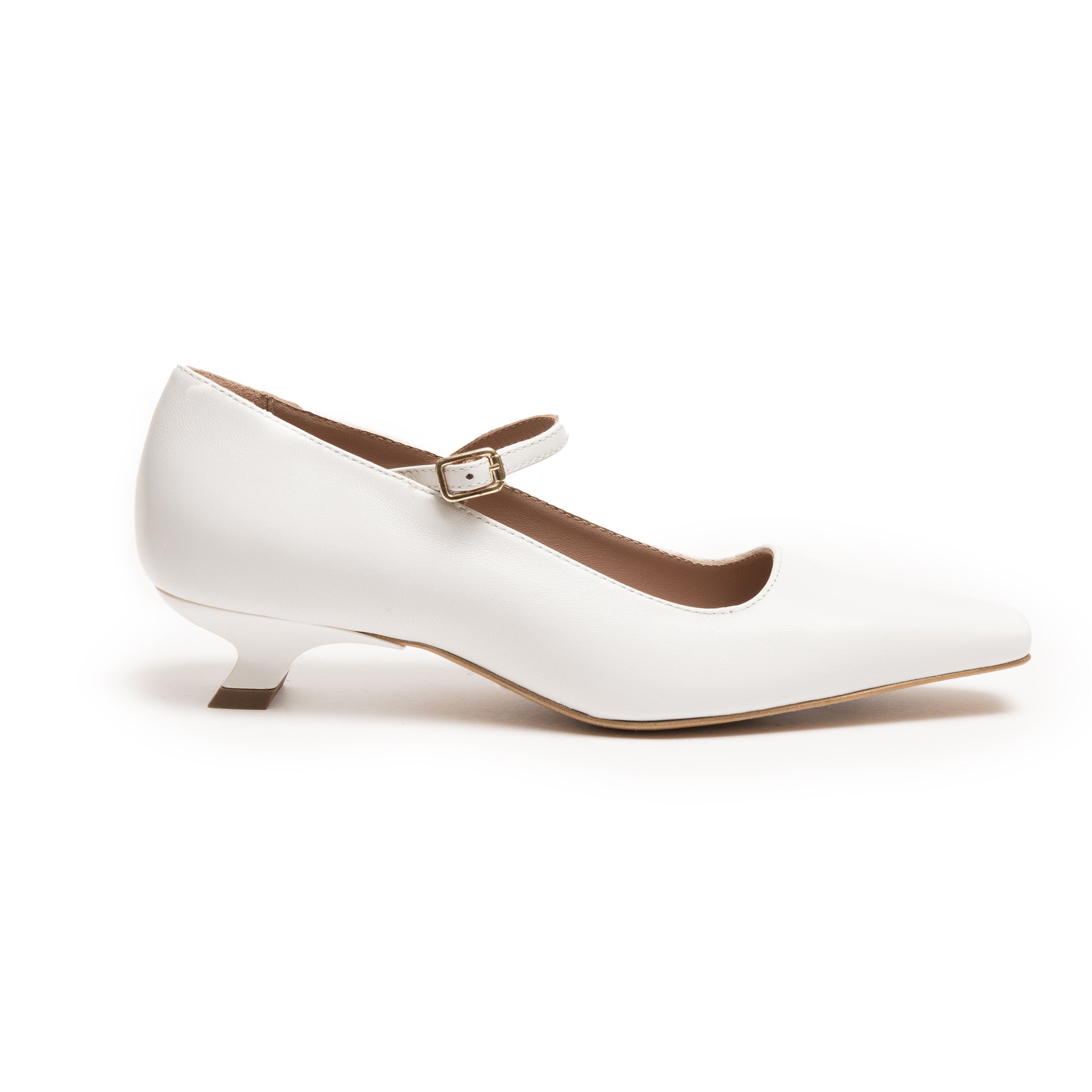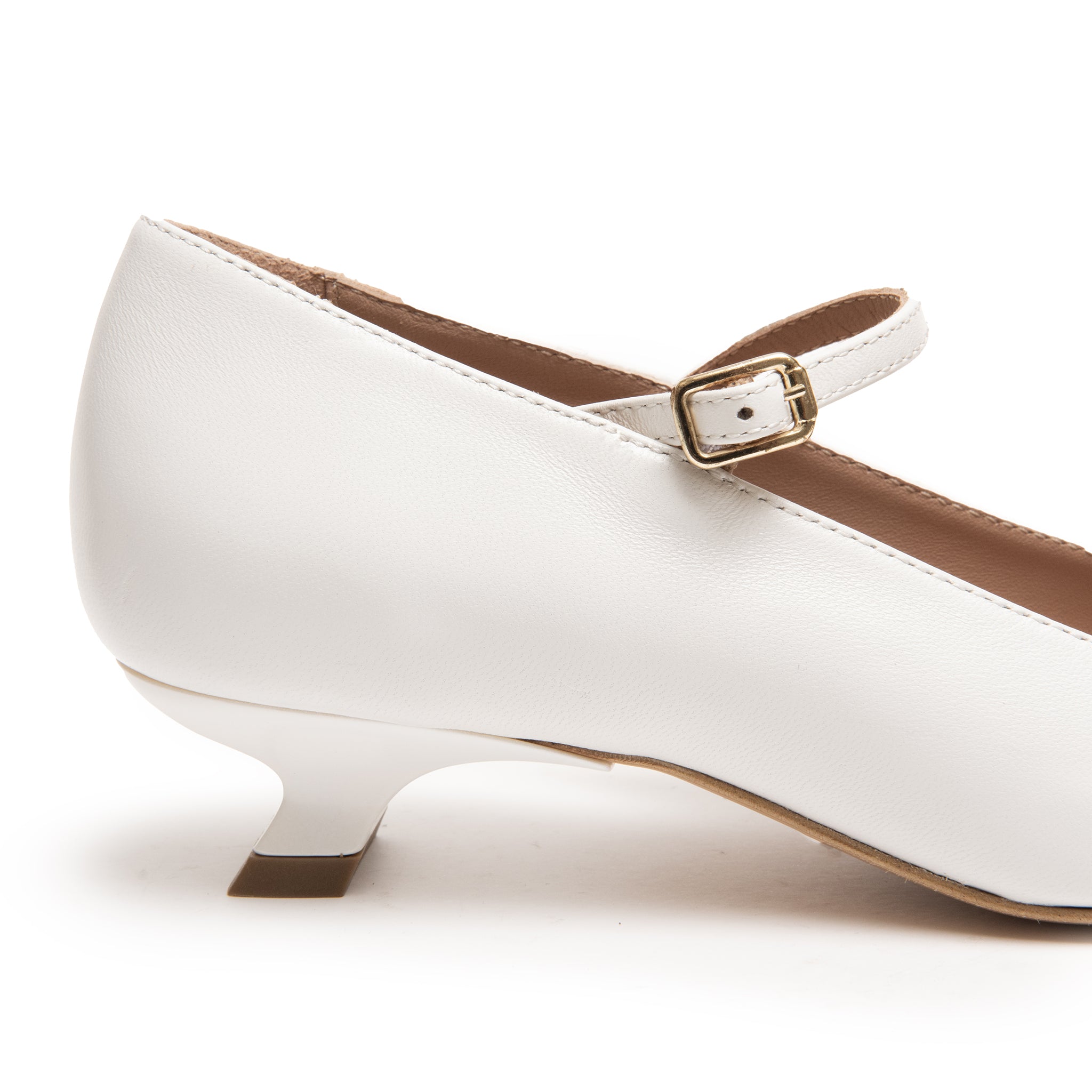 Questo modello è perfetto se la comodità è la tua priorità, un modello lavorato in pelle colore bianco con tacco rivestito tono su tono.