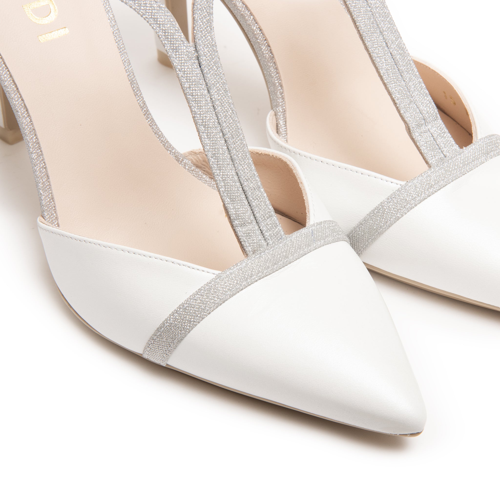 Se desideri qualcosa di speciale per il tuo grande giorno, questa slingback con i suoi giochi di luce argento e la chiusura a T è il modello perfetto per te.