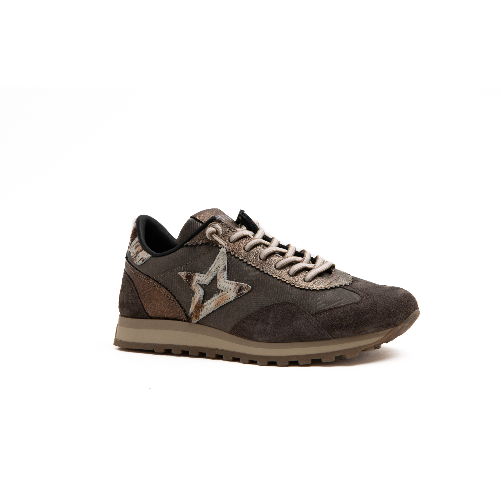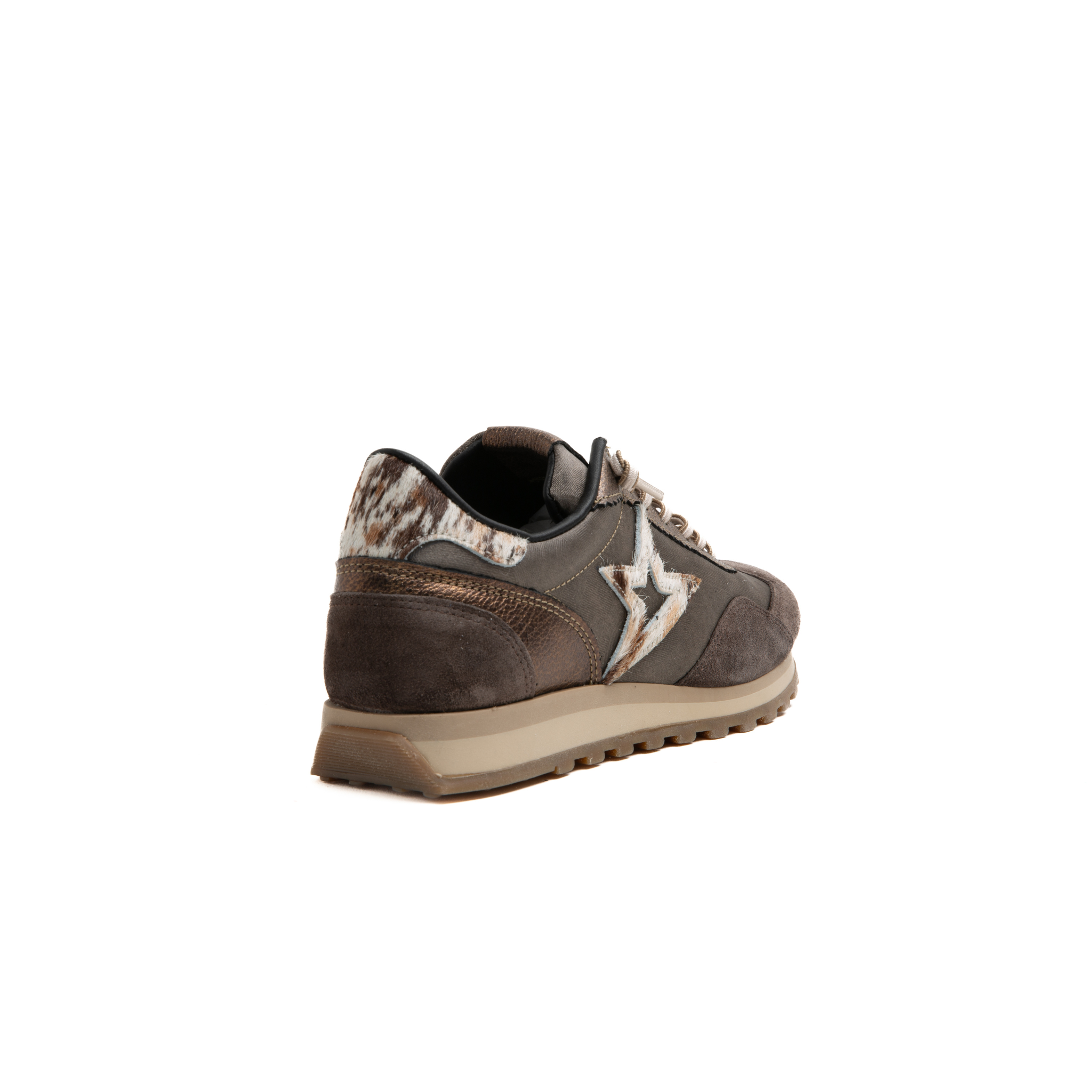 Realizzata con un mix di materiali tra suede, tessuto tecnico e dettagli in pelle laminata bronzo, è impreziosita da dettagli in cavallino stampa animalier.