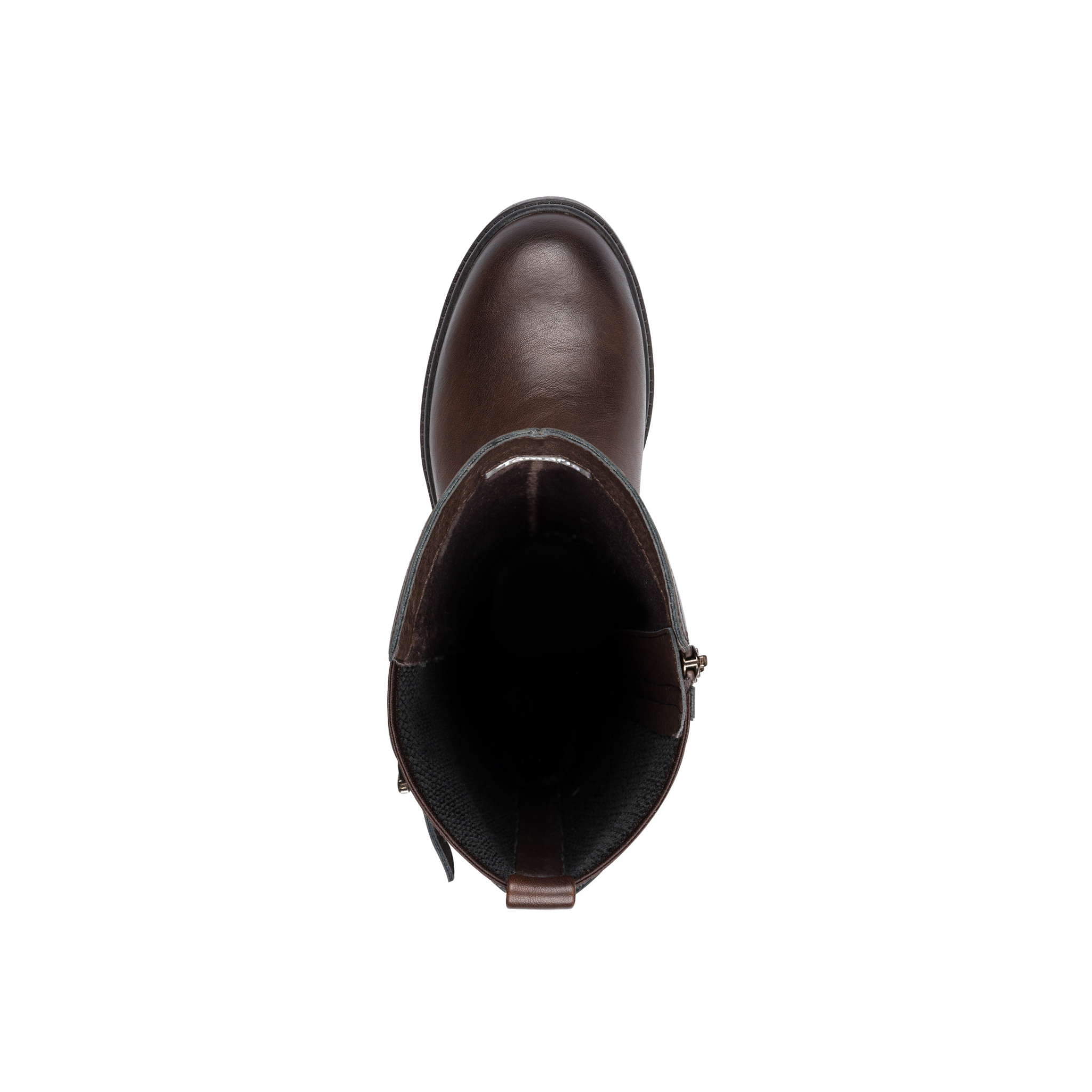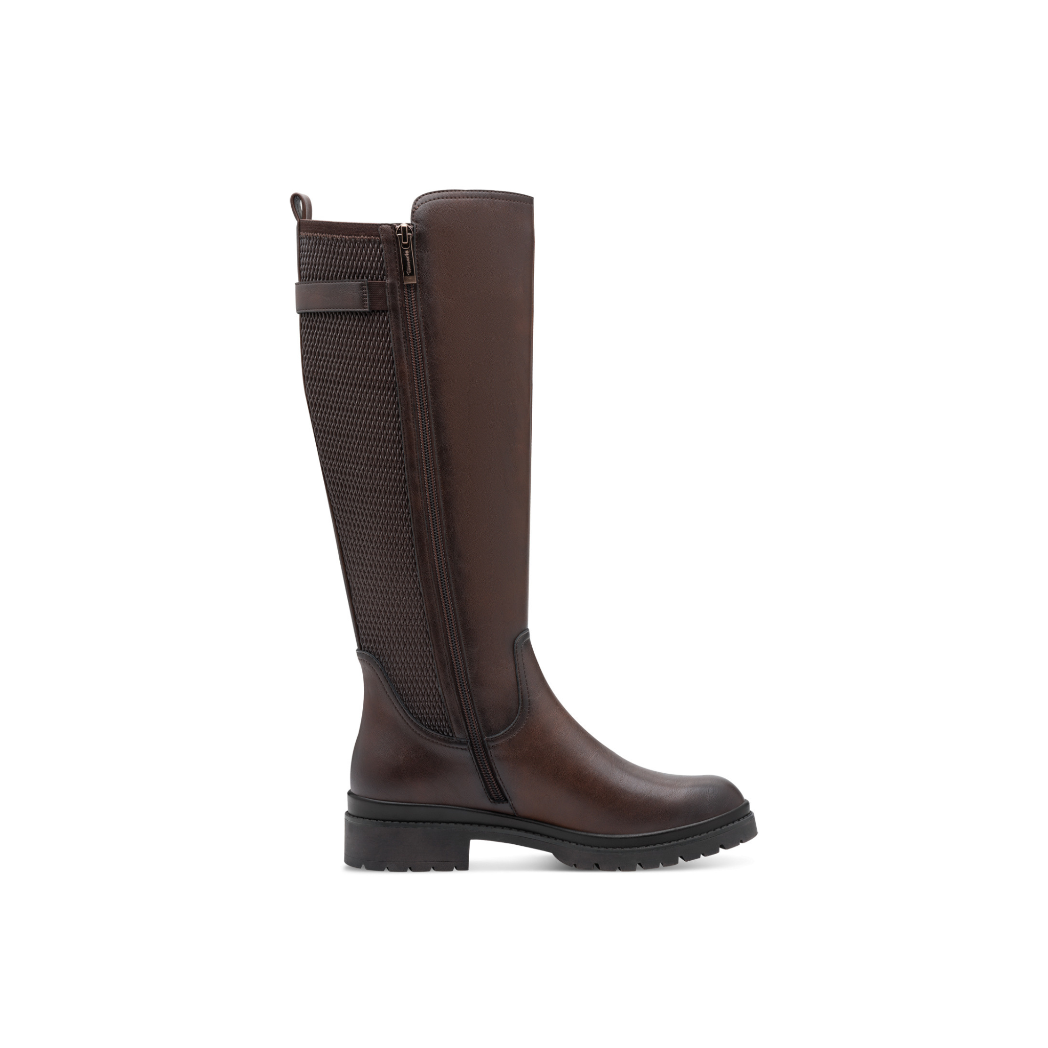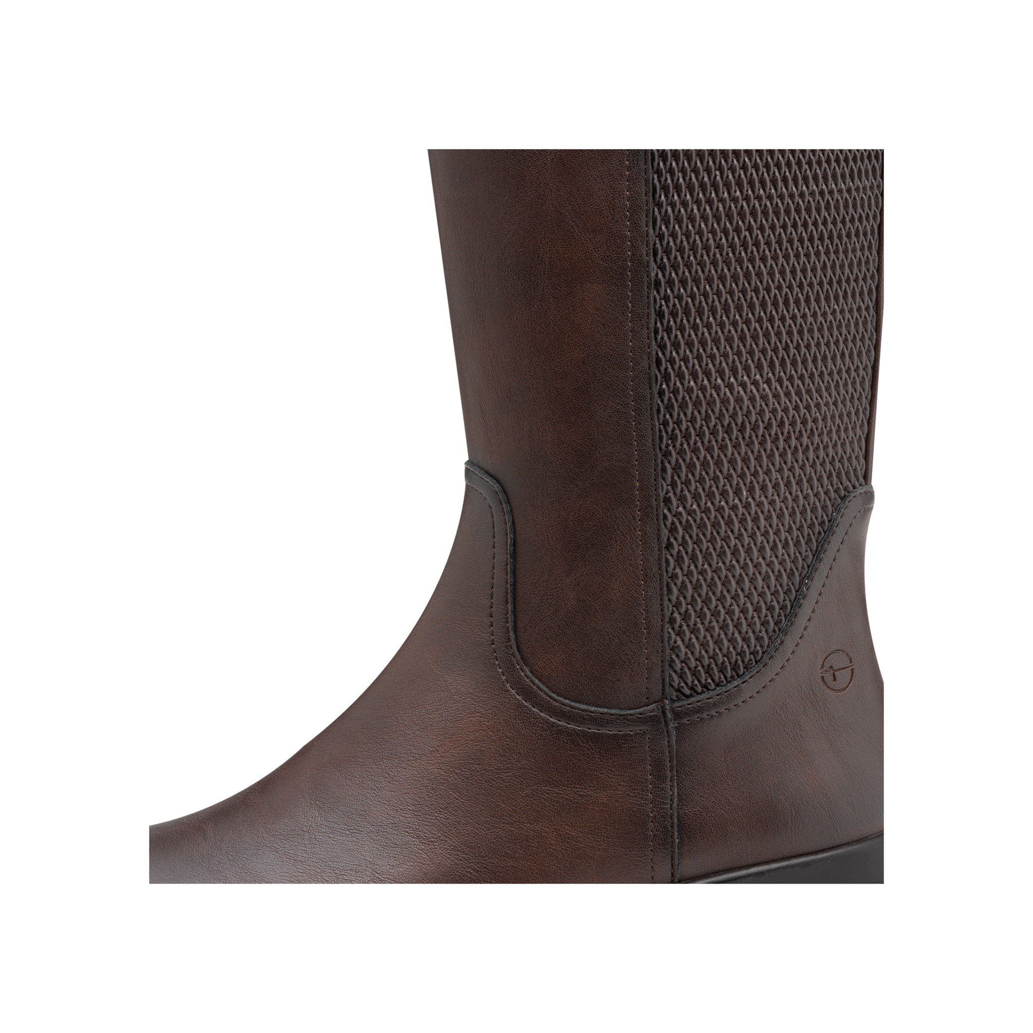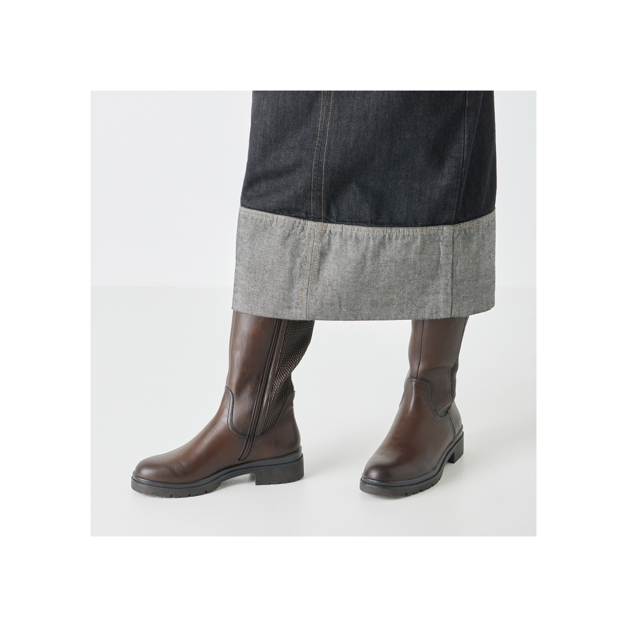Stivale dal design ispirato al mondo equestre, realizzato in materiale effetto pelle color marrone. La parte posteriore del gambale è in tessuto stretch a maglia, che garantisce aderenza e comfort.