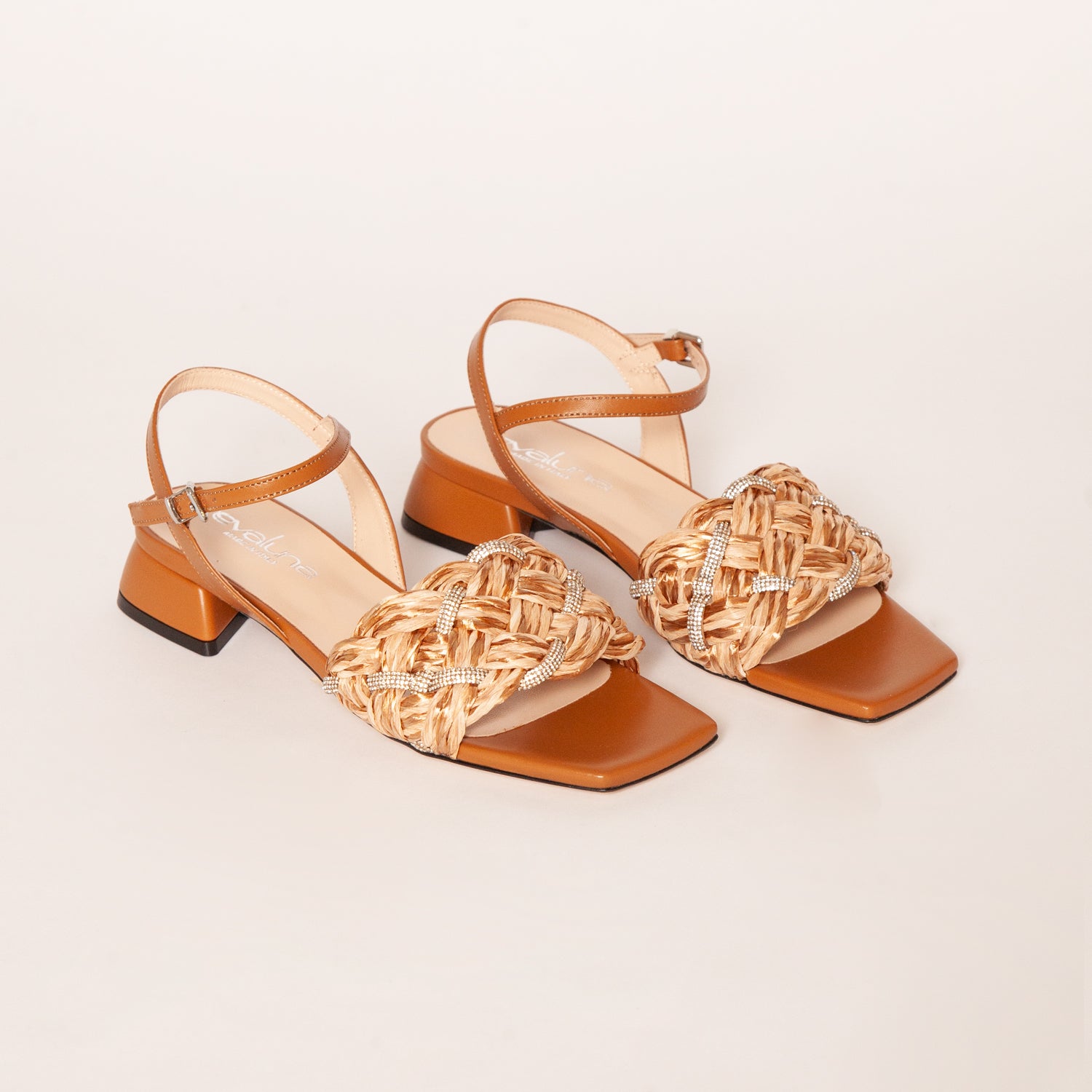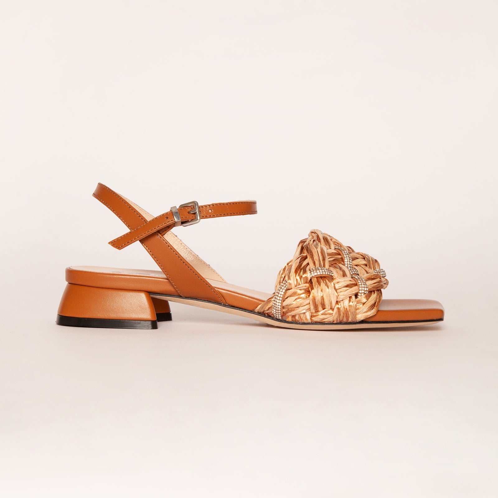 Sandalo basso rafia con dettafli blillanti. suola in cuoio cinturino con fibbia regolabile alla caviglia. Altezza tacco 2,5cm