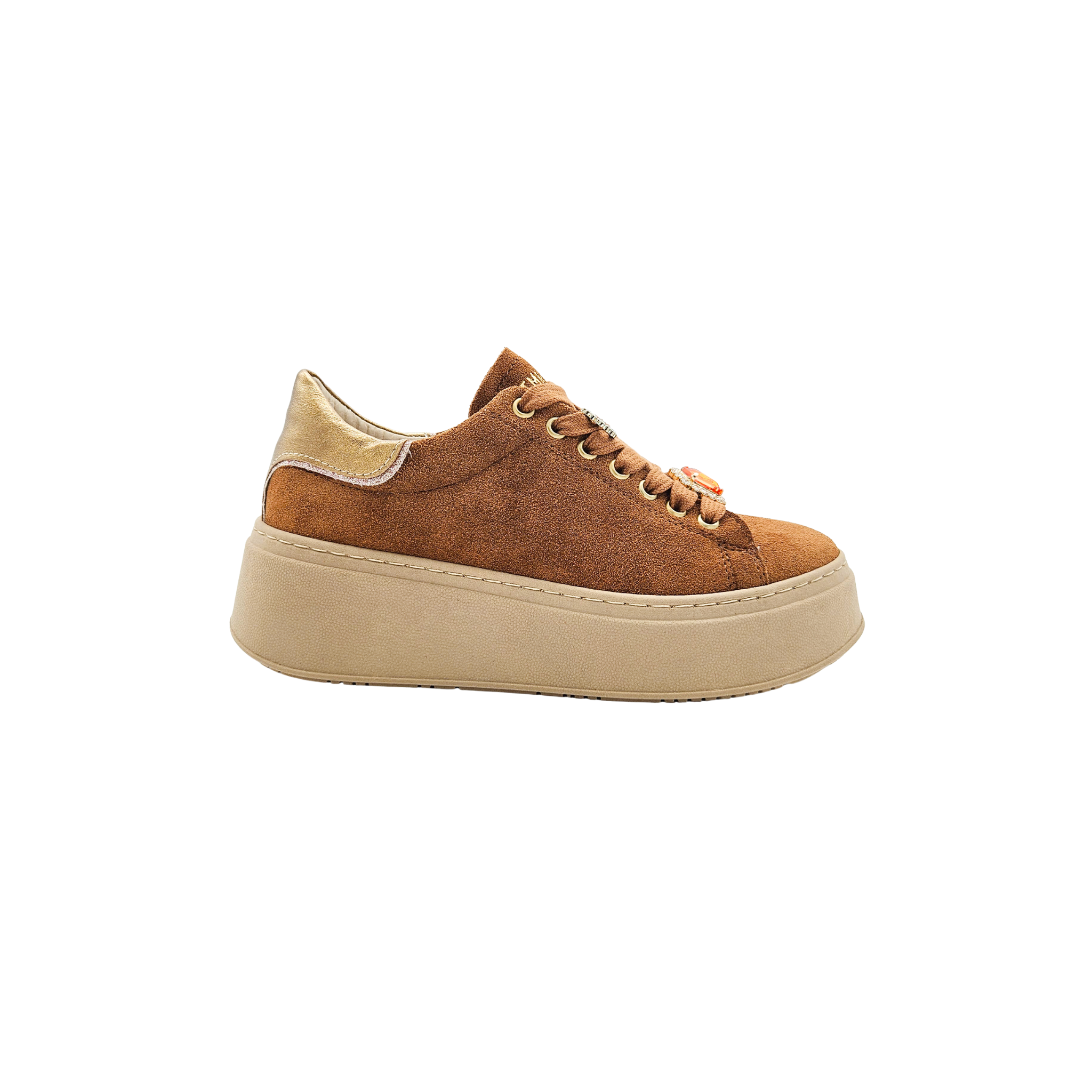 Sneaker in camoscio colore cognac. Dettagli color oro nella parte posteriore, arricchito da strass tono su tono per un tocco luminoso ed elegante.